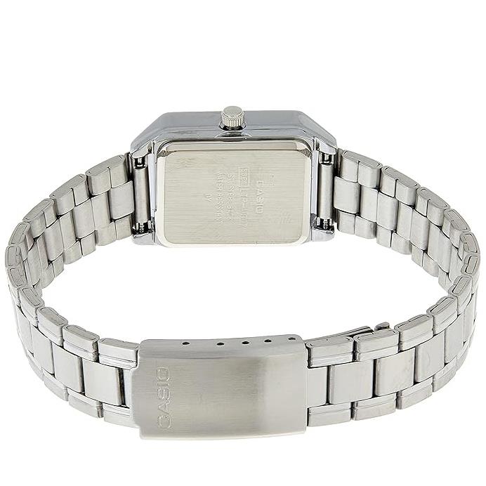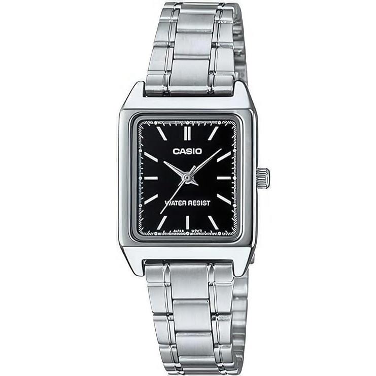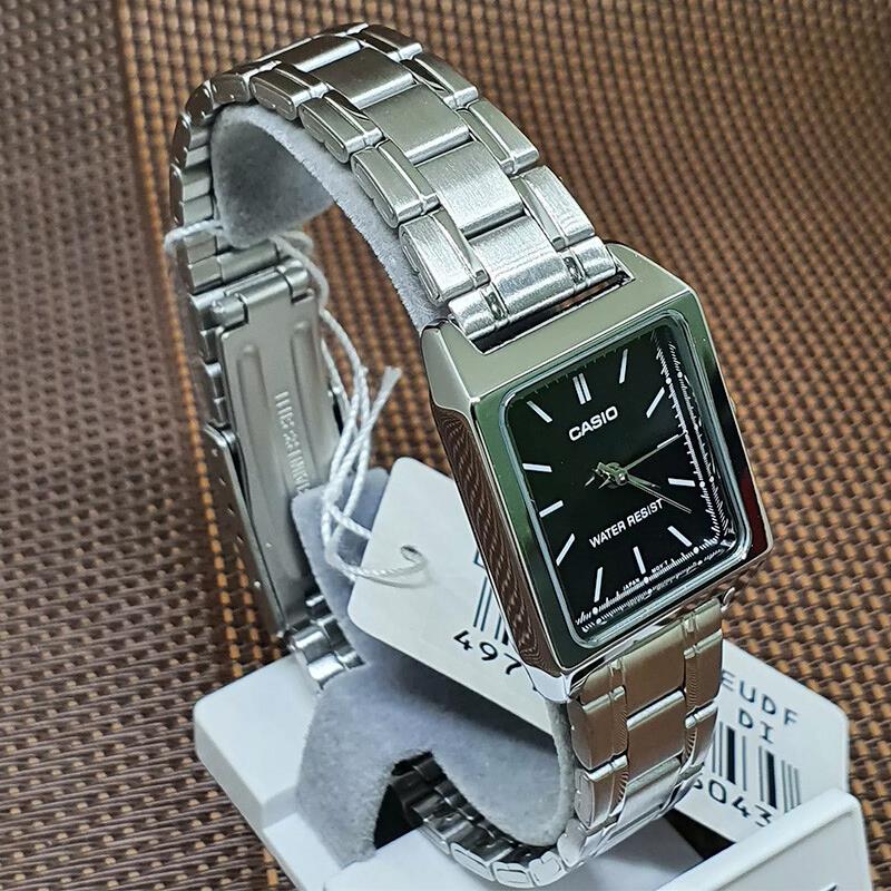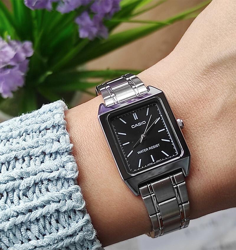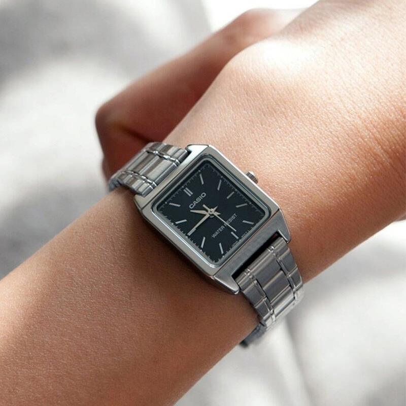 ساعت مچی زنانه کاسیو casio با طراحی روزانه بند استیل با قاب فلزی و صفحه مستطیلی مشکی و موتور ژاپنی با انرژی باتری و مقاوم در برابر آب تا عمق 30 متر به همراه گارانتی بین المللی