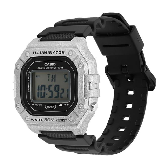 ساعت مچی مردانه کاسیو casio با طراحی روزانه بند سیلیکونی با قاب مربعی نقره ای و صفحه طوسی مشکی با نمایشگر دیجیتالی و قابلیت کرنوگراف روزهای هفته روز و شب نور پشت صفحه دو زمانه زنگ هشدار و موتور ژاپنی با انرژی باتری و مقاوم در برابر آب تا عمق 50 متر به همراه گارانتی بین المللی