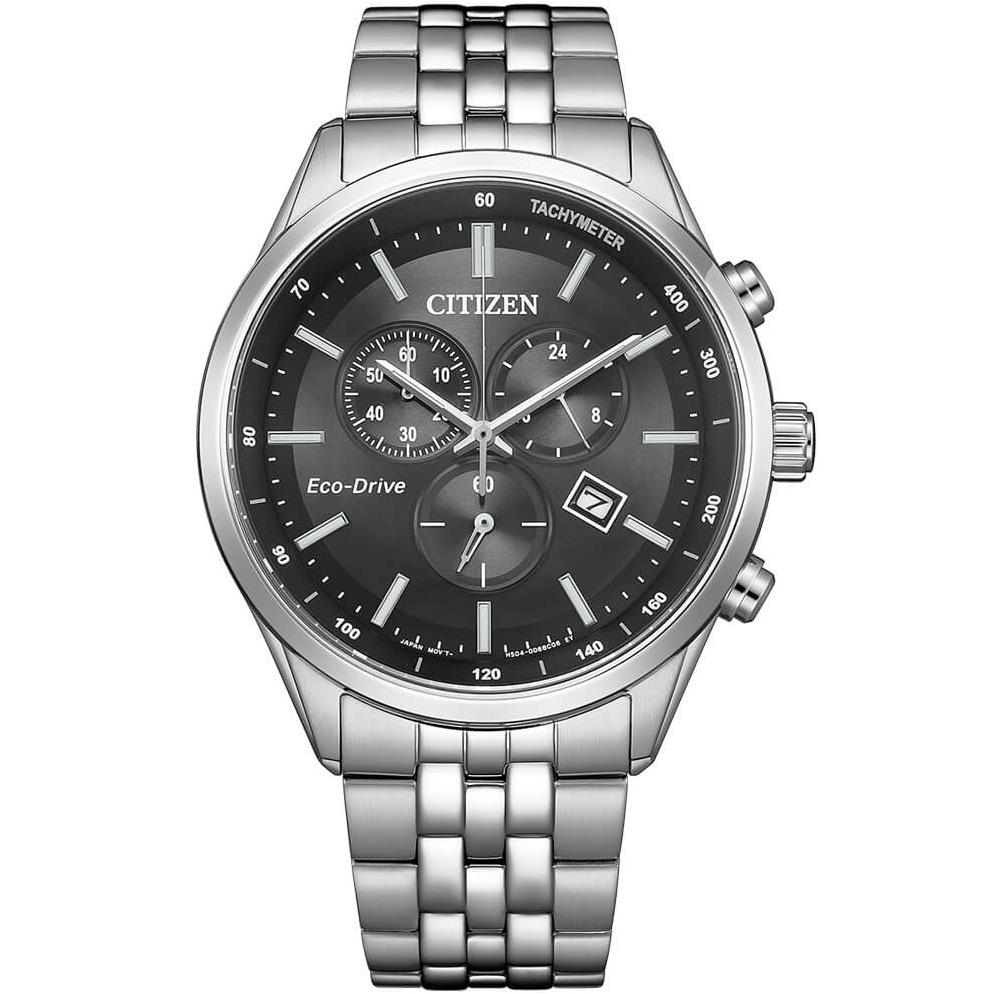 ساعت مچی مردانه سیتیزن citizen با طراحی روزانه بند استیل و قاب استیل و صفحه گرد مشکی با شیشه ضد خراش و قابلیت داشتن تقویم / کرنوگراف / زه تاچی متر/ شبنما و موتور اکودرایو ژاپنی و مقاومت در برابر آب تا عمق 100 متر به همراه گارانتی بین المللی