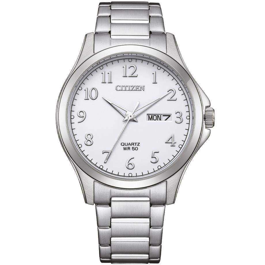ساعت مچی مردانه سیتیزن citizen با طراحی روزانه بند استیل و قاب استیل و صفحه گرد سفید با قابلیت داشتن تقویم /روزهای هفته/ شبنما و موتور ژاپنی با انرژی باتری و مقاومت در برابر آب تا عمق 50 متر به همراه گارانتی بین المللی