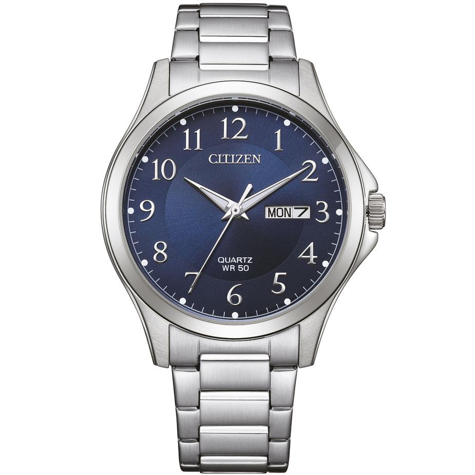ساعت مچی مردانه سیتیزن citizen با طراحی روزانه بند استیل و قاب استیل و صفحه گرد سرمه ای با قابلیت داشتن تقویم /روزهای هفته/ شبنما و موتور ژاپنی با انرژی باتری و مقاومت در برابر آب تا عمق 50 متر به همراه گارانتی بین المللی