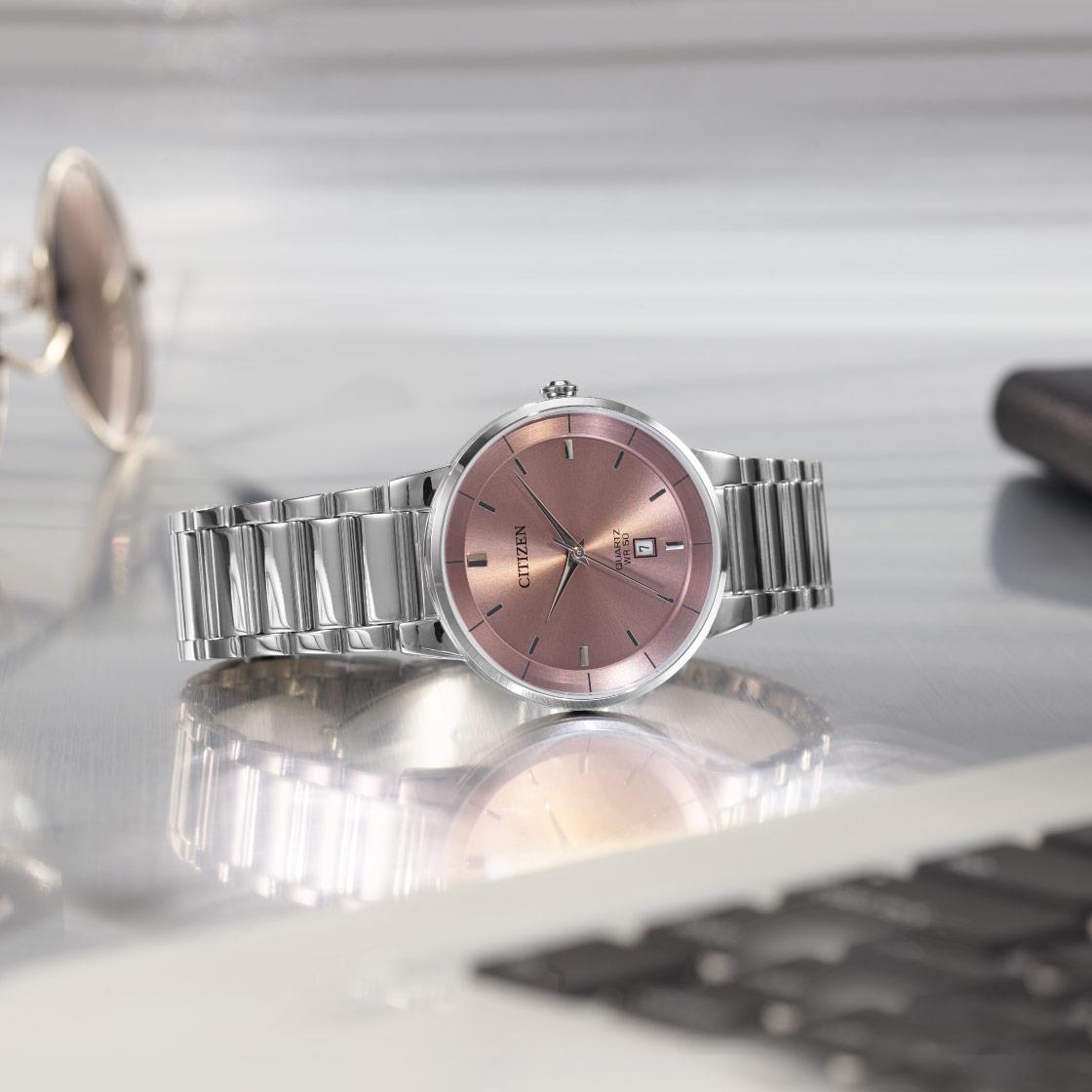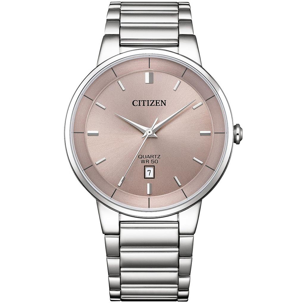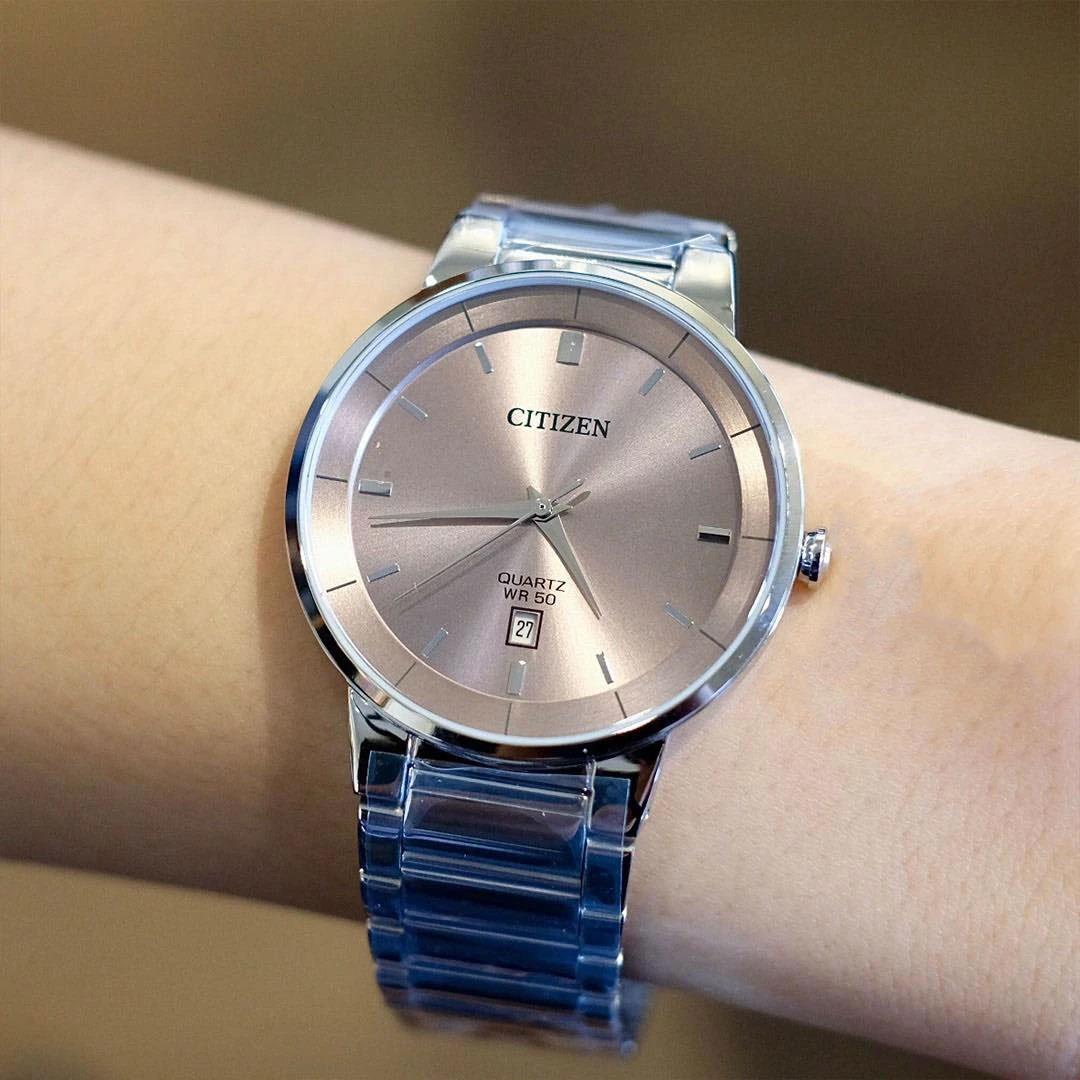 ساعت مچی مردانه سیتیزن citizen با طراحی روزانه بند استیل و قاب استیل و صفحه گرد رزگلد با قابلیت داشتن تقویم  و موتور ژاپنی با انرژی باتری و مقاومت در برابر آب تا عمق 50 متر به همراه گارانتی بین المللی