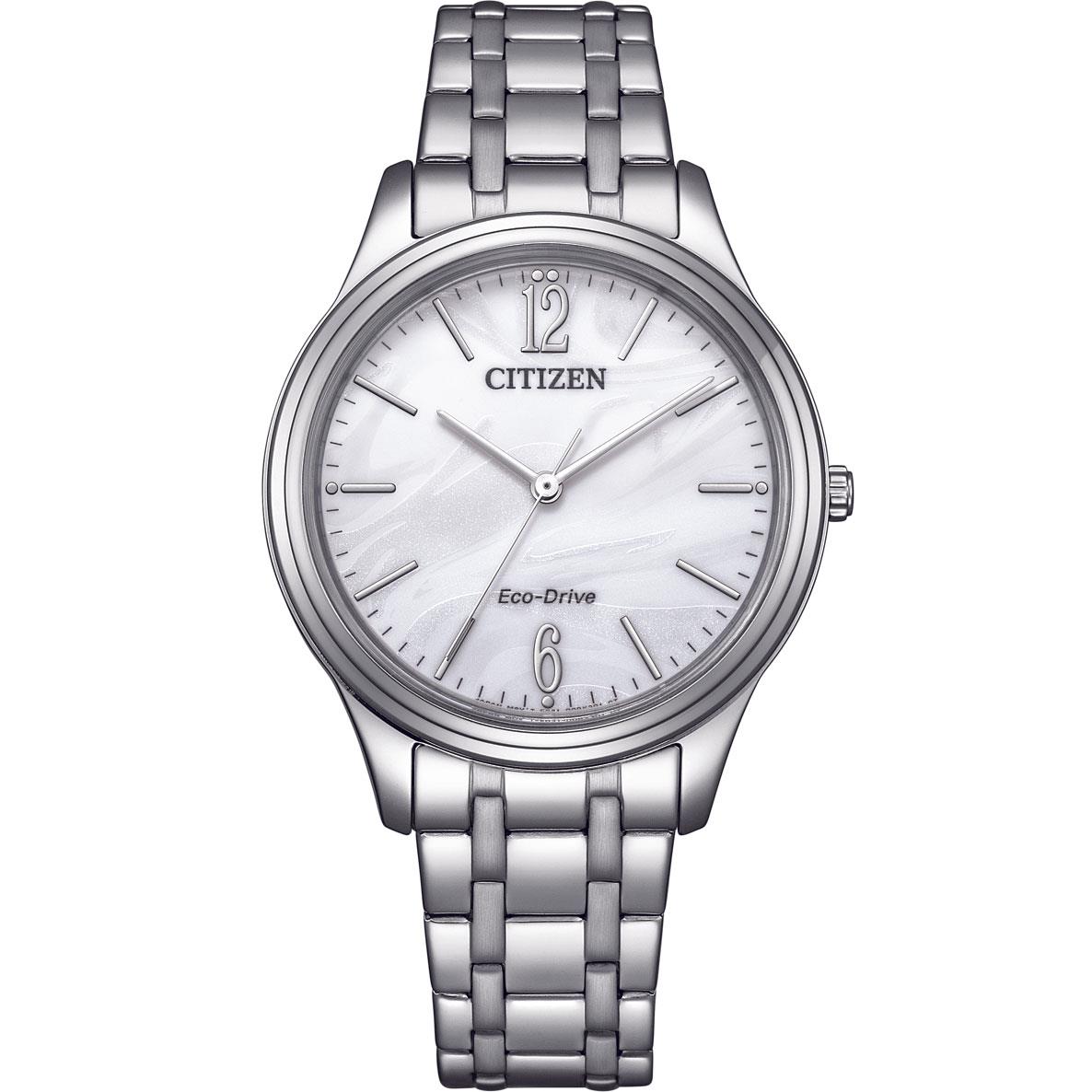 ساعت مچی زنانه سیتیزن citizen با طراحی روزانه بند استیل و قاب استیل و صفحه گرد سفید صدفی و موتور اکودرایو ژاپنی و مقاومت در برابر آب تا عمق 50 متر به همراه گارانتی بین المللی
