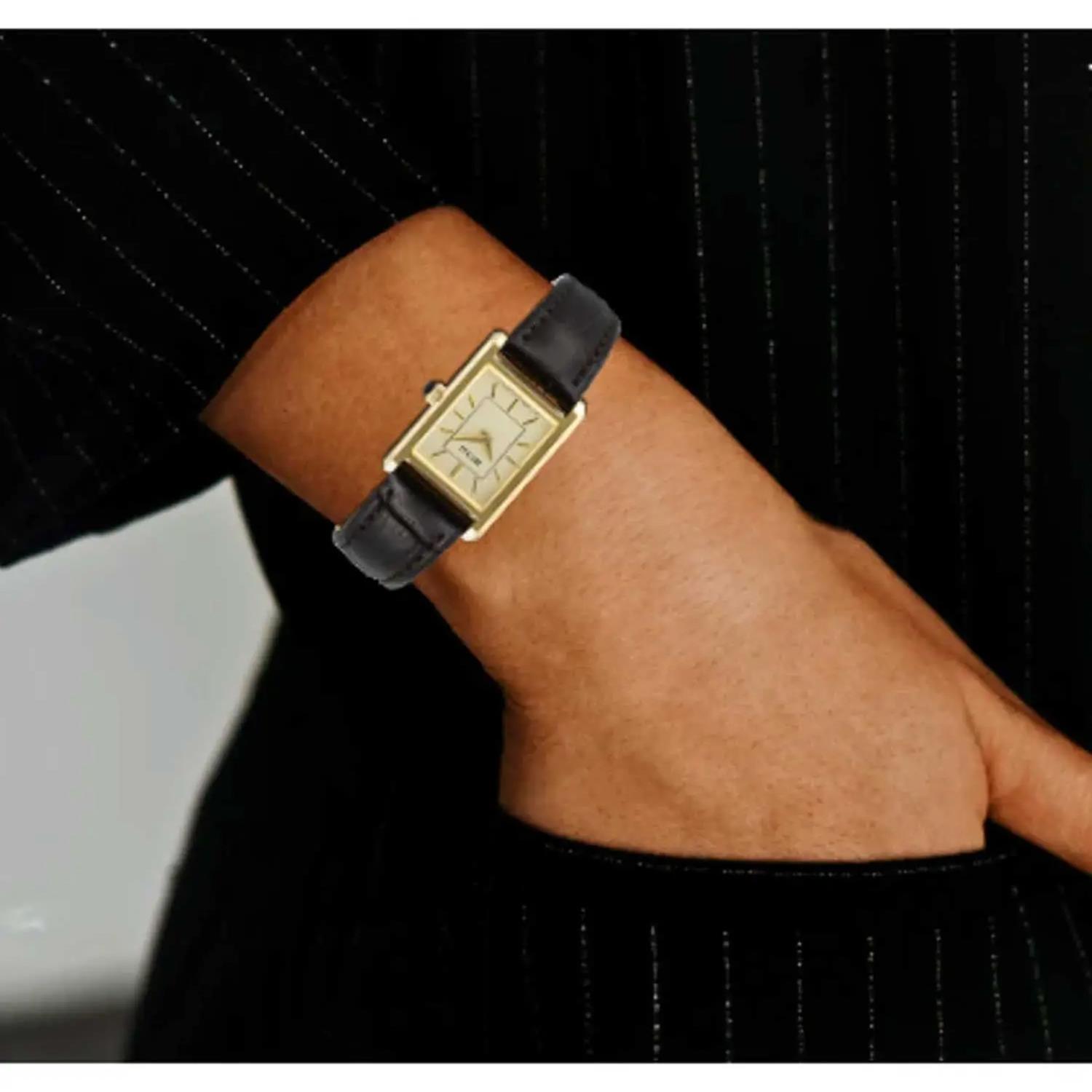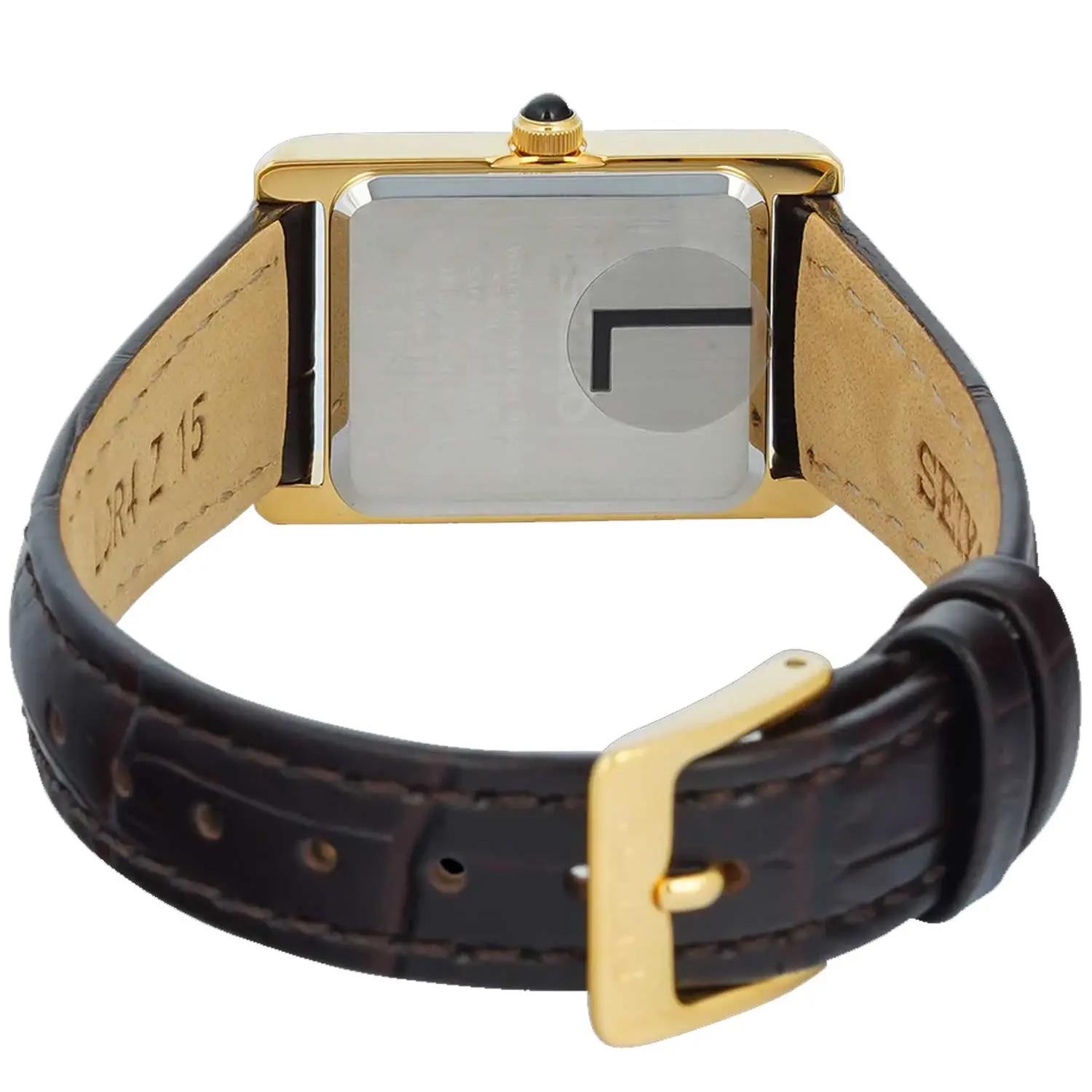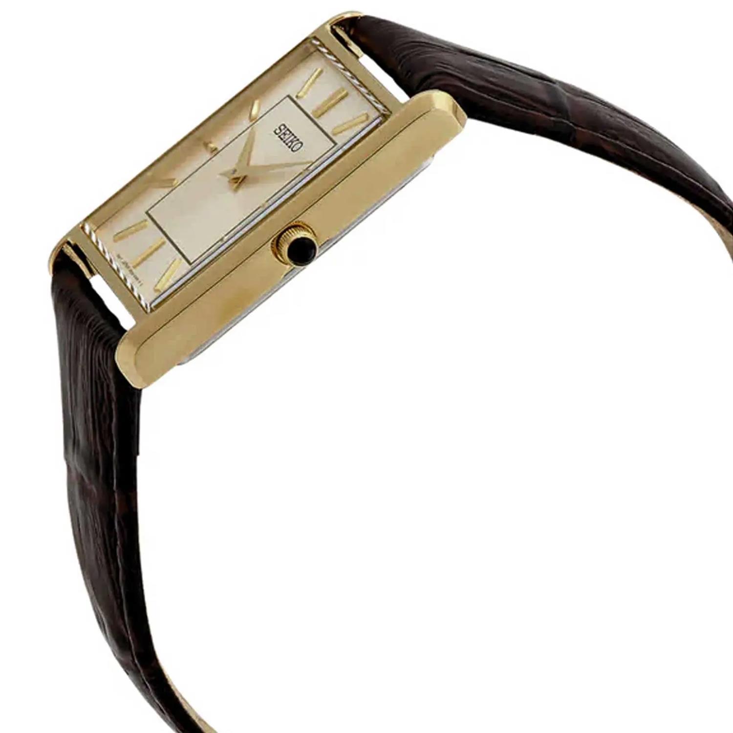 ساعت مچی زنانه سیکو SEIKO با طراحی کلاسیک بند چرمی قهوه ای با قاب مستطیلی طلایی و صفحه  طلایی با شیشه ضد خراش و موتور ژاپنی با انرژی باتری و مقاومت در برابر آب تا عمق 50 متر به همراه دو سال گارانتی بین المللی
