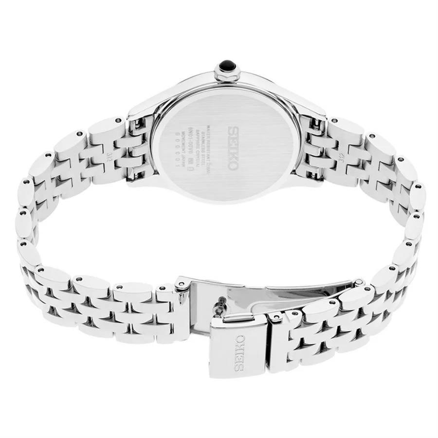 ساعت مچی زنانه سیکو SEIKO با طراحی کلاسیک بند استیل با قاب استیل و صفحه گرد نقره ای با شیشه ضد خراش و موتور ژاپنی با انرژی باتری و مقاومت در برابر آب تا عمق 50 متر به همراه دو سال گارانتی بین المللی