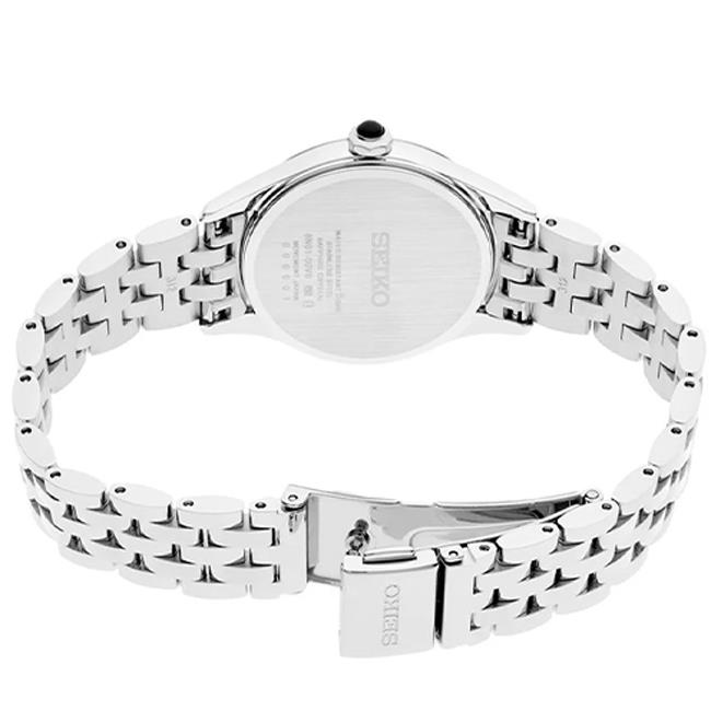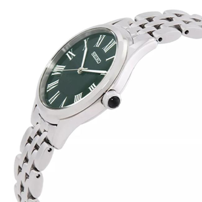 ساعت مچی زنانه سیکو SEIKO با طراحی کلاسیک بند استیل با قاب استیل و صفحه گرد سبز با شیشه ضد خراش و موتور ژاپنی با انرژی باتری و مقاومت در برابر آب تا عمق 50 متر به همراه دو سال گارانتی بین المللی
