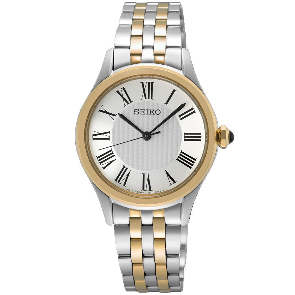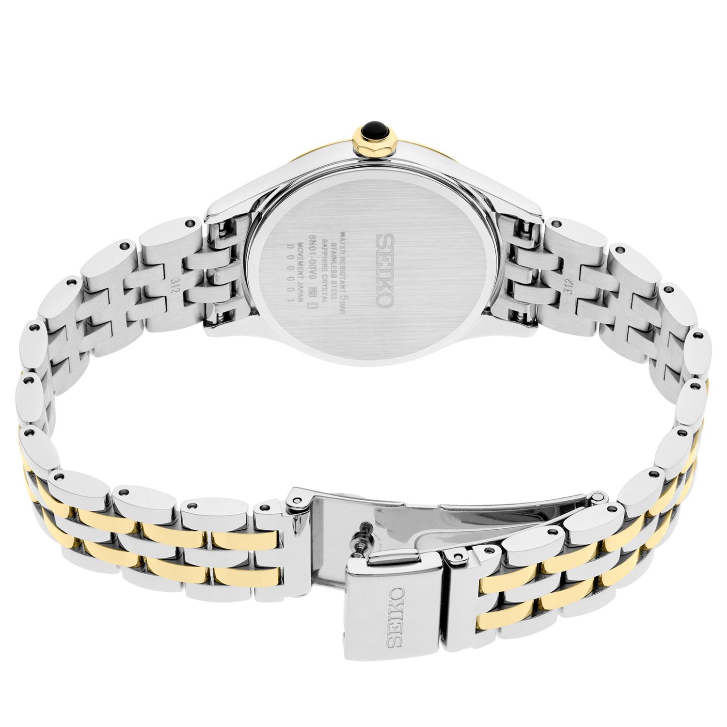 ساعت مچی زنانه سیکو SEIKO با طراحی کلاسیک بند استیل طلایی با قاب دو رنگ و صفحه گرد نقره ای با شیشه ضد خراش و موتور ژاپنی با انرژی باتری و مقاومت در برابر آب تا عمق 50 متر به همراه دو سال گارانتی بین المللی