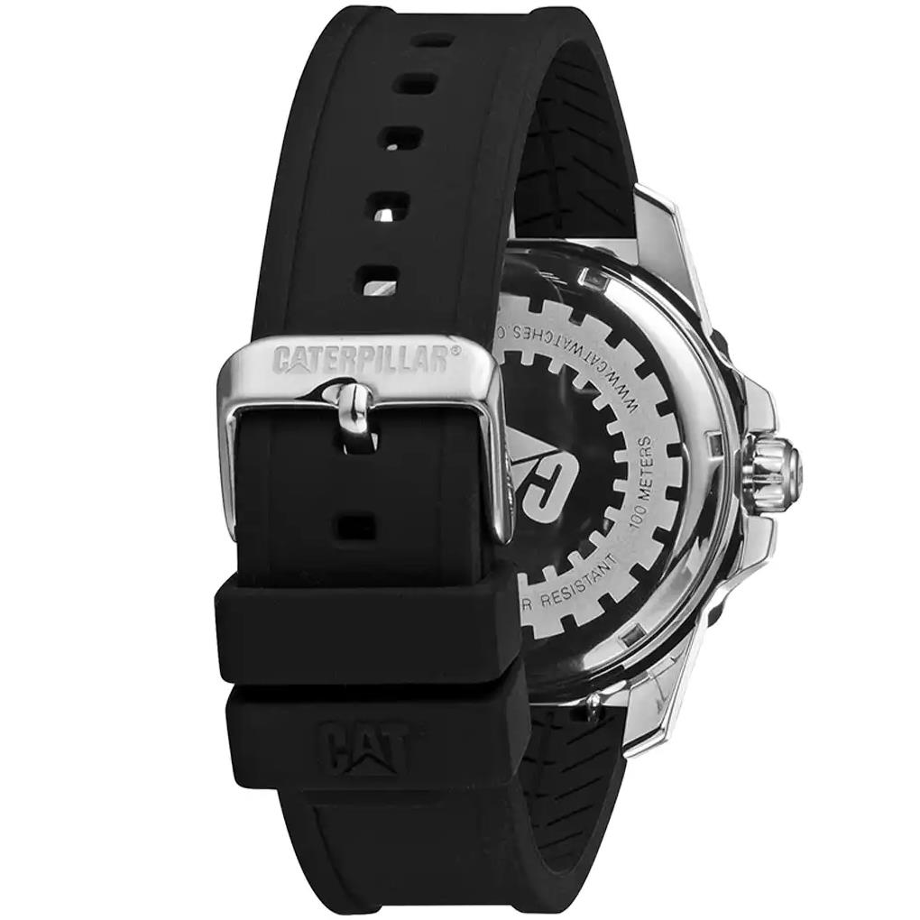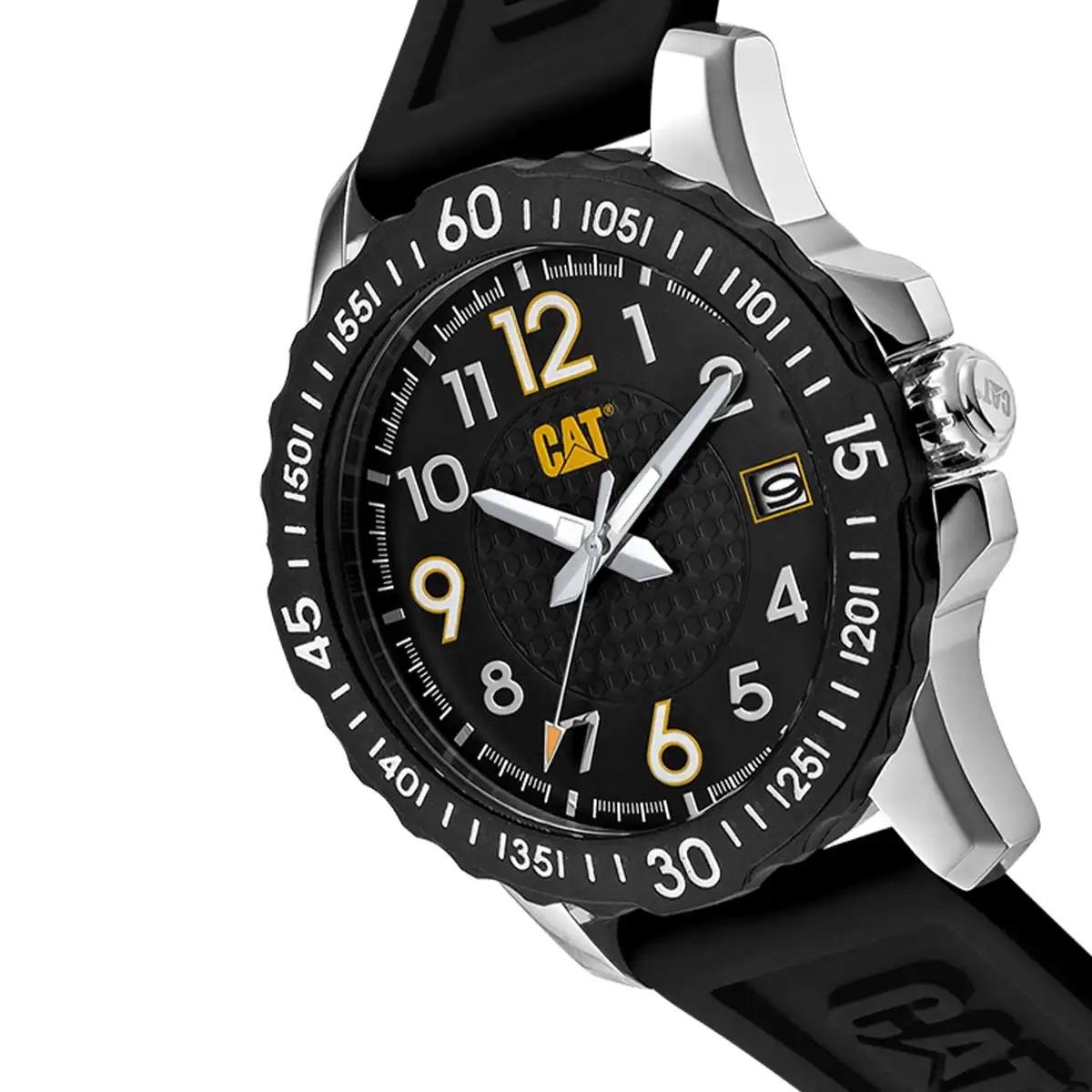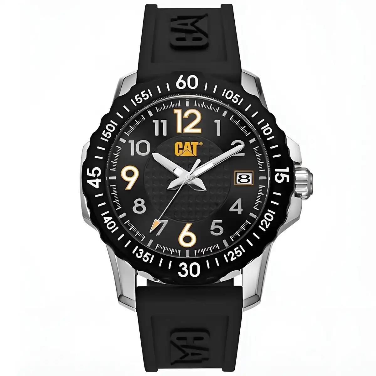 ساعت مچی مردانه کاترپیلار cat با طراحی اسپرت بند سیلیکونی و قاب گرد مشکی استیل و صفحه گرد مشکی با قابلیت داشتن تقویم / شب نما با موتور ژاپنی و انرژی باتری و مقاوم در برابر آب تا عمق 100 متر به همراه گارانتی بین المللی