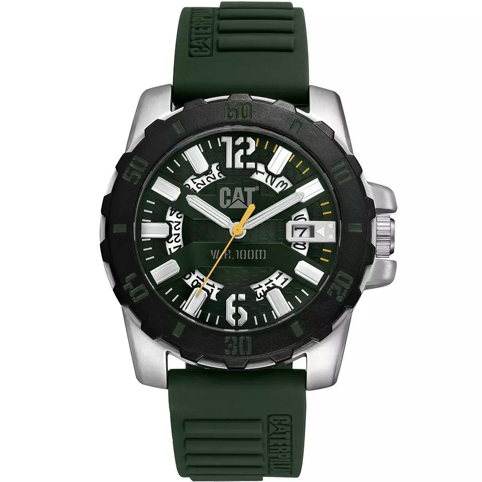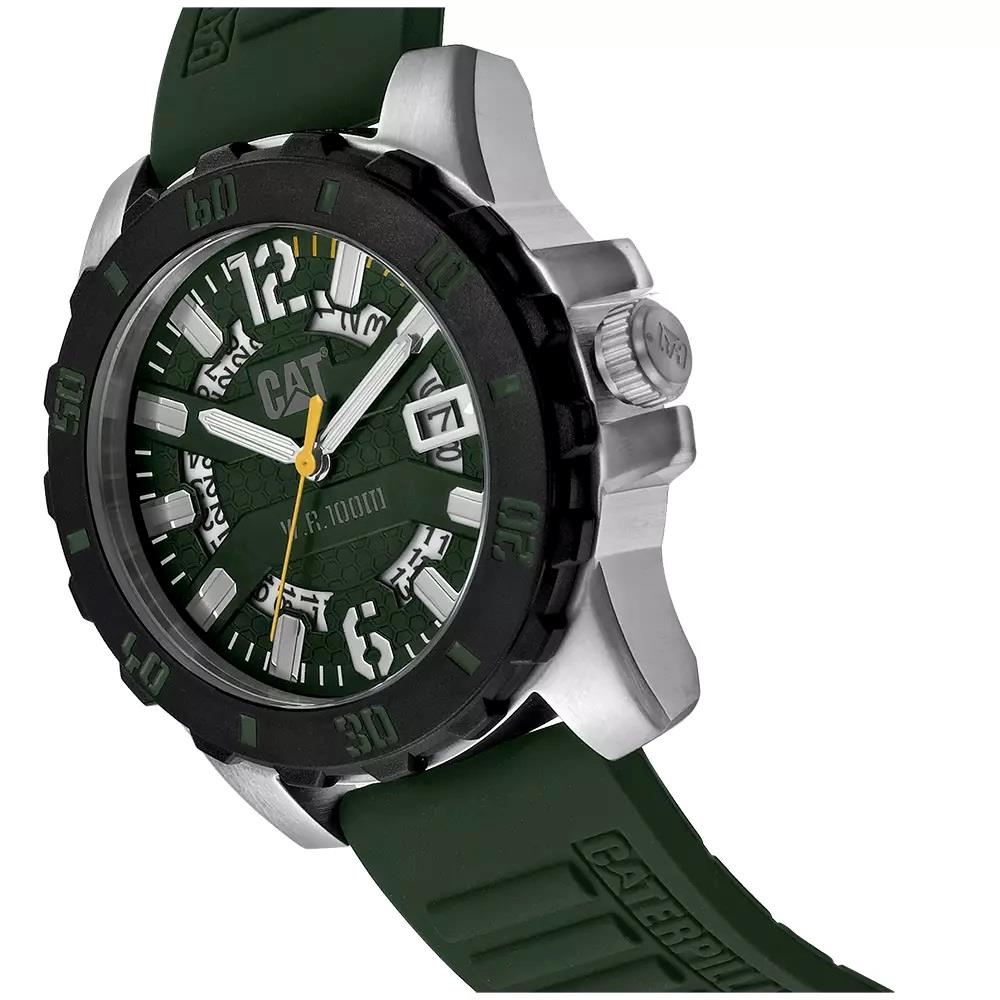 ساعت مچی مردانه کاترپیلار cat با طراحی اسپرت بند سیلیکونی سبز و قاب دو رنگ فلزی و صفحه سبز با نمایشگرعقربه ای و قابلیت داشتن شبنما /  تقویم با موتور ژاپنی و انرژی باتری و مقاوم در برابر آب تا عمق 100 متر به همراه گارانتی بین المللی