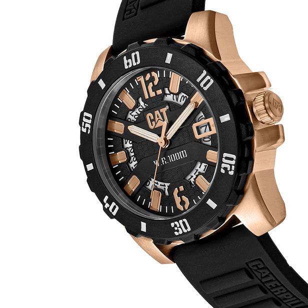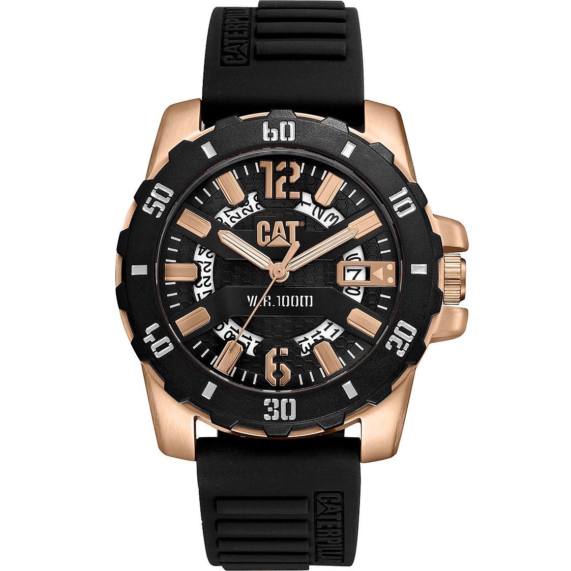 ساعت مچی مردانه کاترپیلار cat با طراحی اسپرت بند سیلیکونی مشکی و قاب دو رنگ فلزی و صفحه مشکی با نمایشگرعقربه ای و قابلیت داشتن شبنما,تقویم با موتور ژاپنی و انرژی باتری و مقاوم در برابر آب تا عمق 100 متر به همراه گارانتی بین المللی