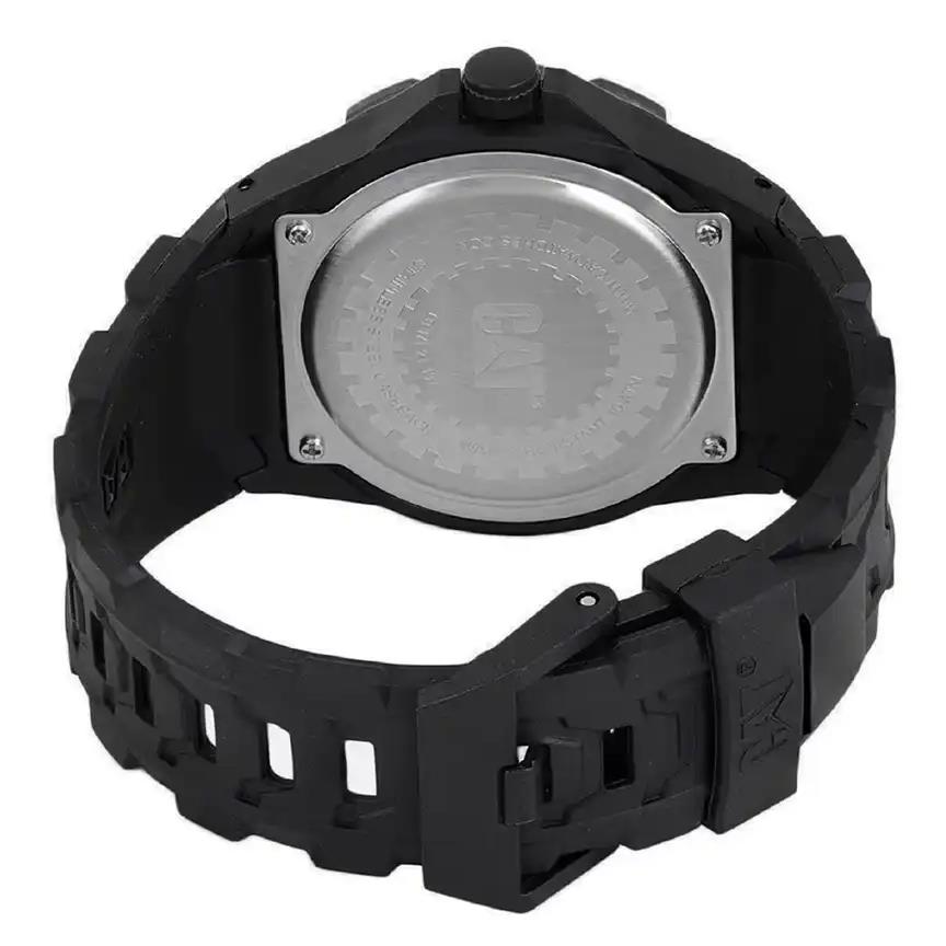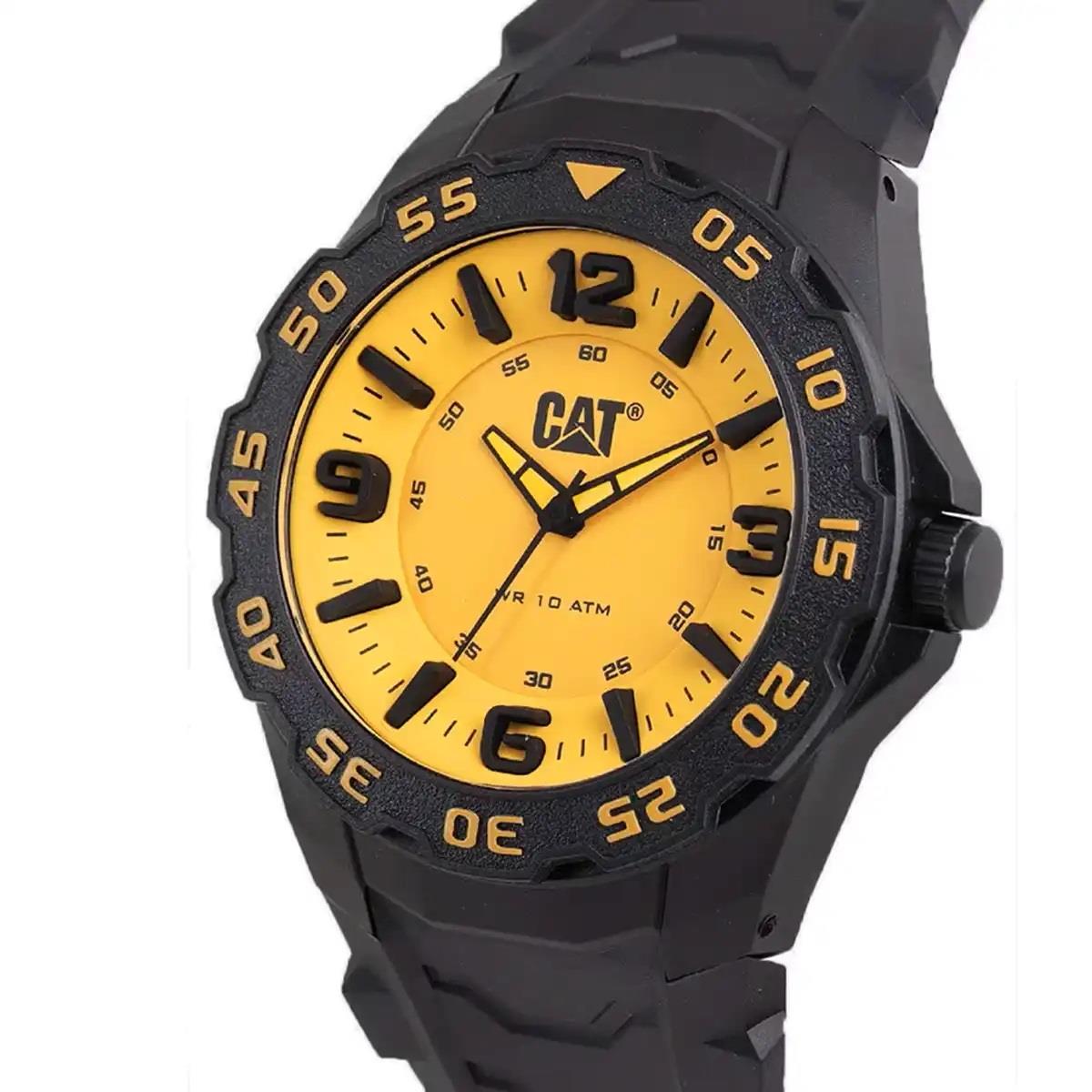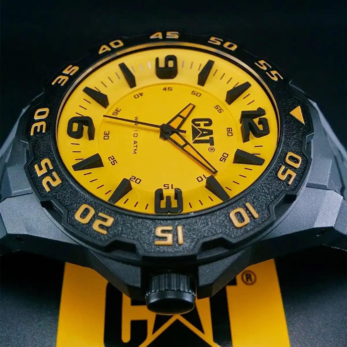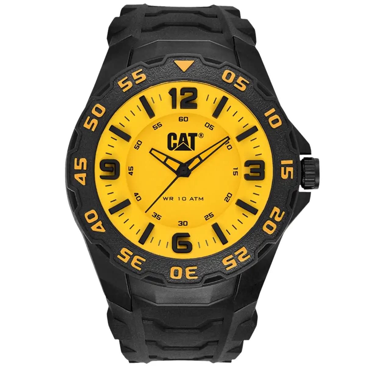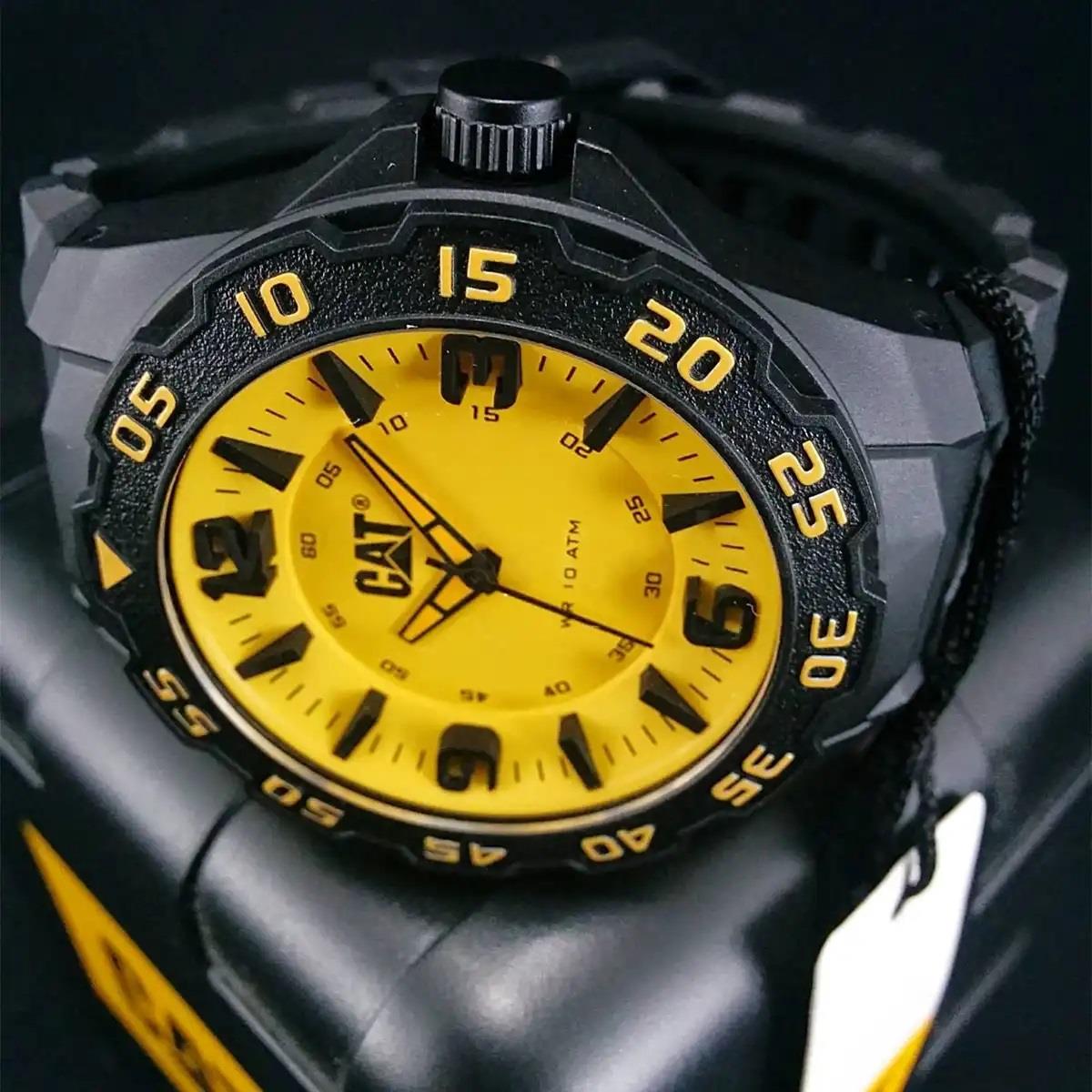 ساعت مچی مردانه کاترپیلار cat با طراحی اسپرت بند سیلیکونی مشکی و قاب گرد مشکی و صفحه زرد با قابلیت داشتن شب نما و موتور ژاپنی با انرژی باتری و مقاوم در برابر آب تا عمق 100 متر به همراه گارانتی بین المللی