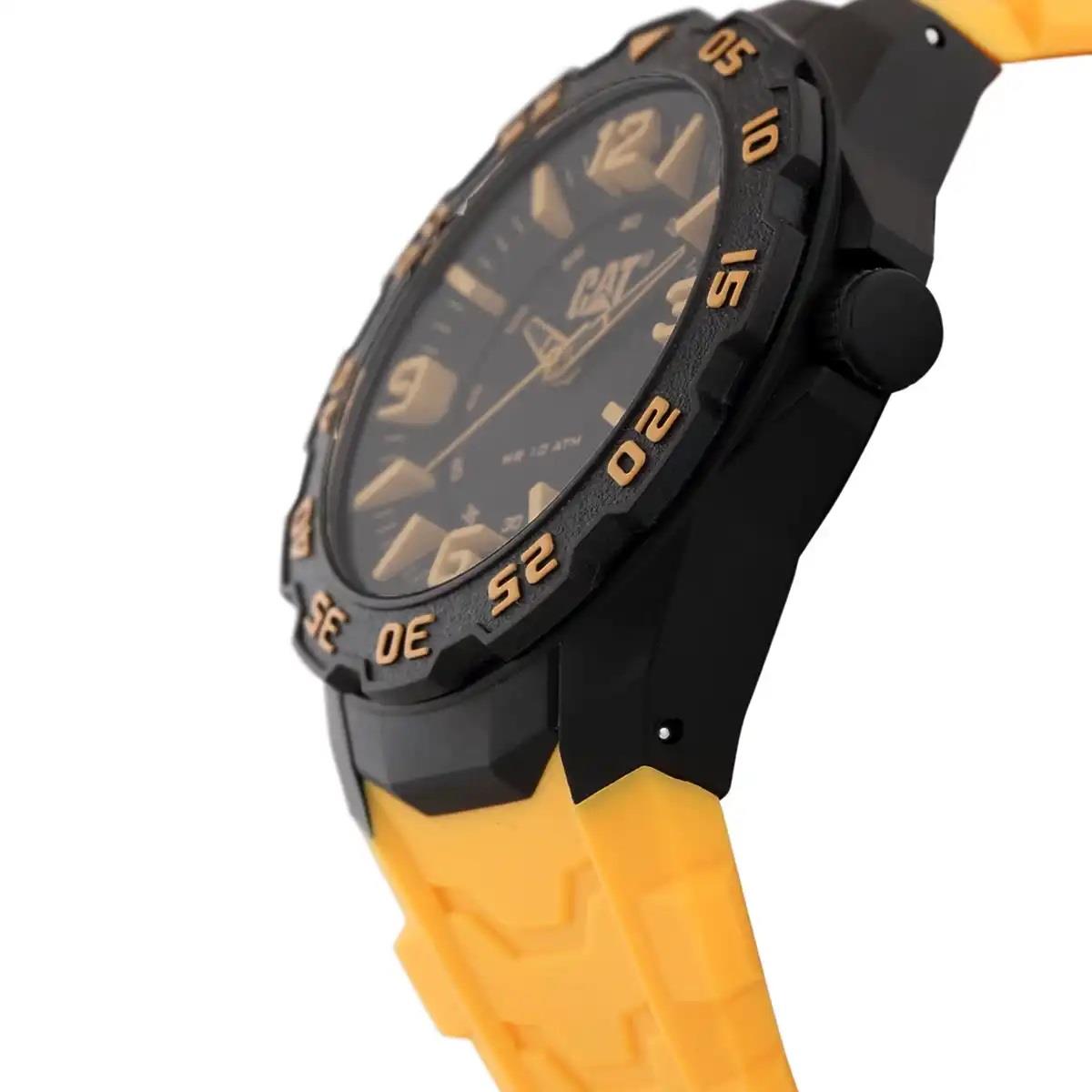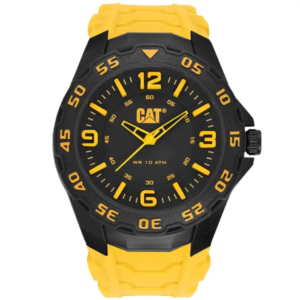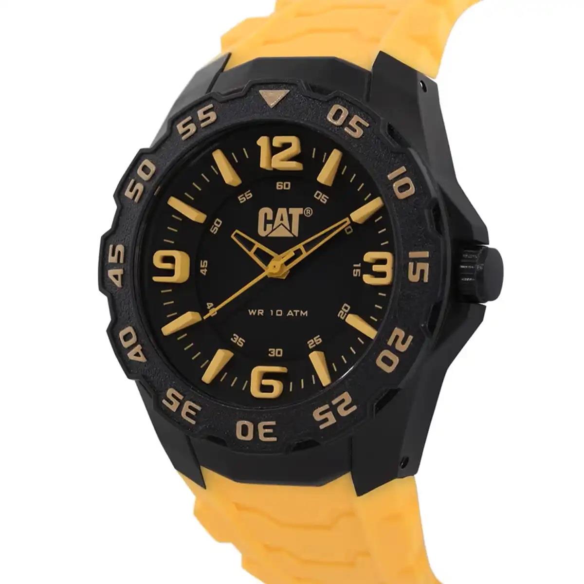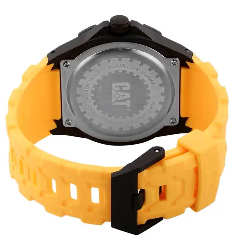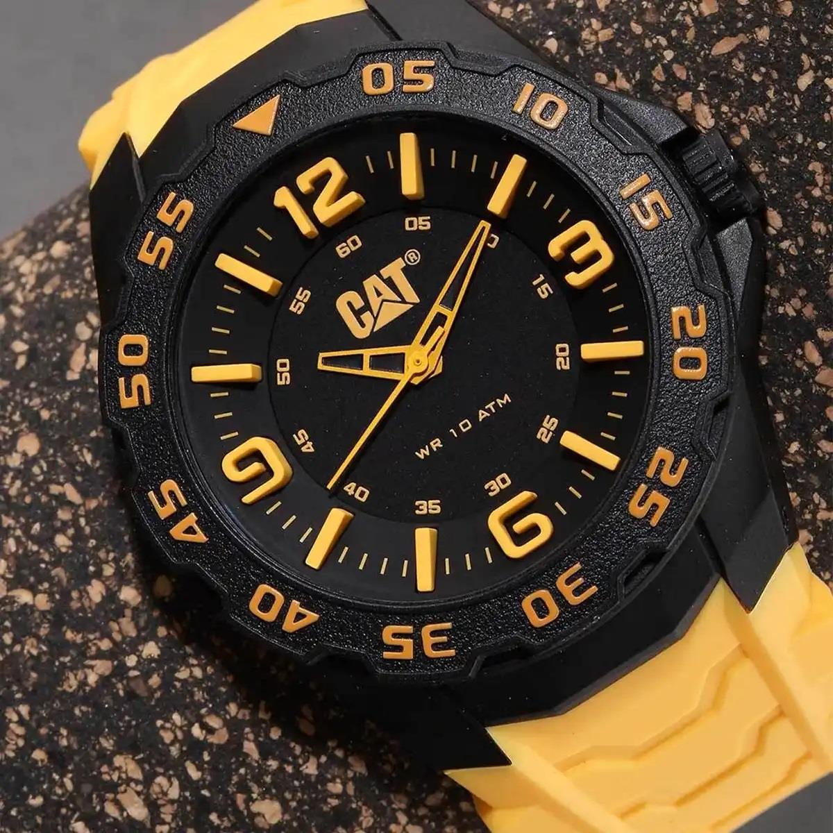 ساعت مچی مردانه کاترپیلار cat با طراحی اسپرت بند سیلیکونی زرد و قاب گرد مشکی و صفحه مشکی با قابلیت داشتن شب نما و موتور ژاپنی با انرژی باتری و مقاوم در برابر آب تا عمق 100 متر به همراه گارانتی بین المللی
