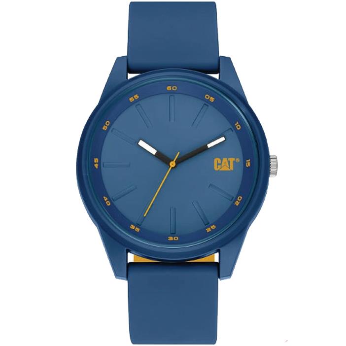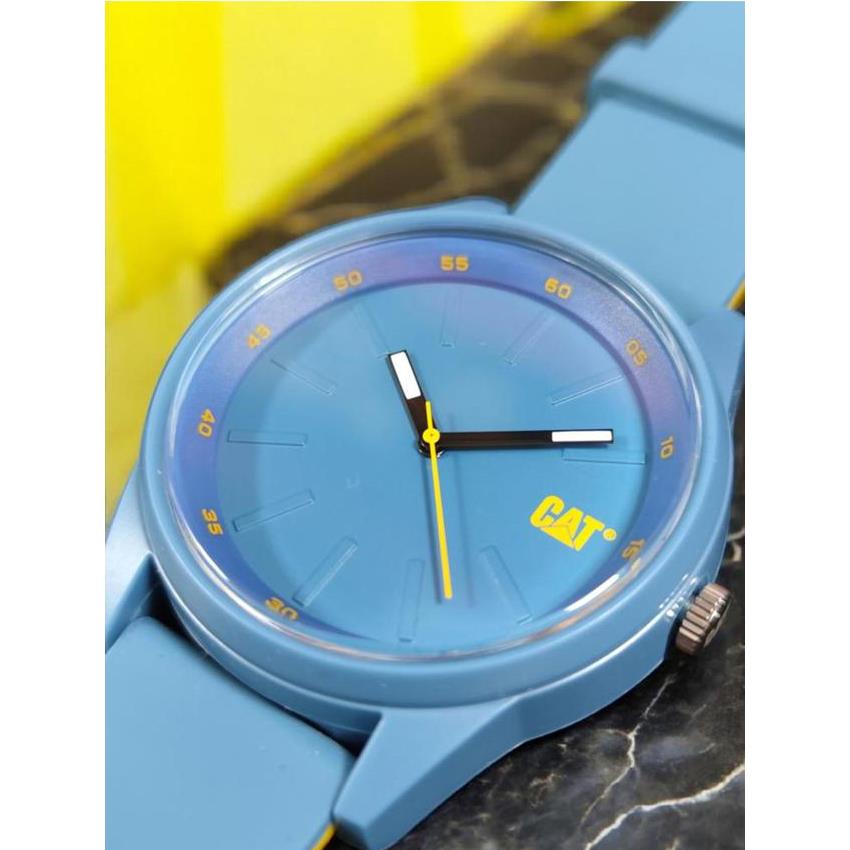 ساعت مچی مردانه کاترپیلار cat با طراحی اسپرت بند سیلیکونی آبی و قاب گرد آبی و صفحه آبی با نمایشگرعقربه ای و قابلیت داشتن شبنما با موتور ژاپنی و انرژی باتری و مقاوم در برابر آب تا عمق 100 متر به همراه گارانتی بین المللی