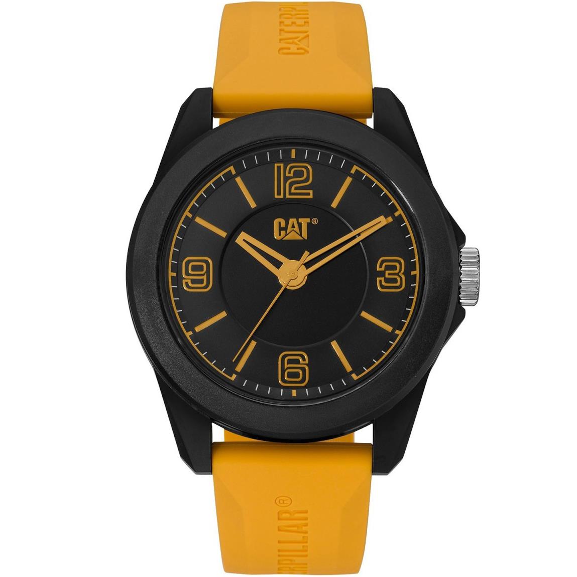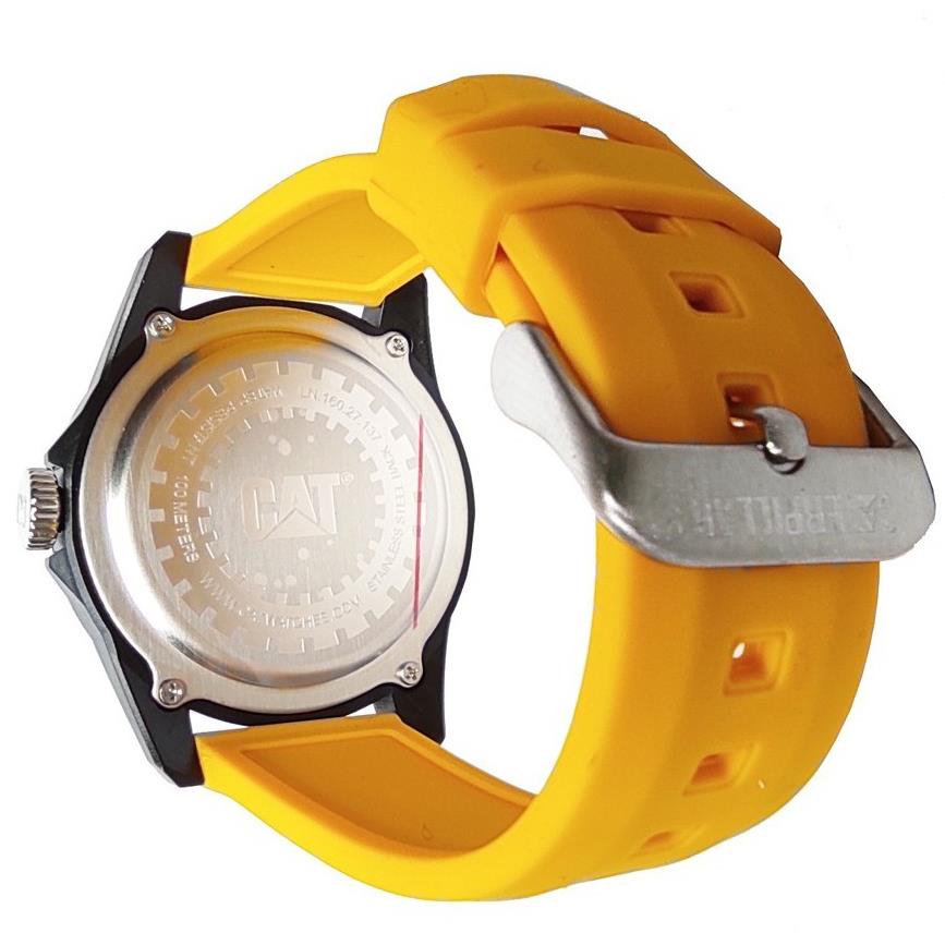 ساعت مچی مردانه کاترپیلار cat با طراحی اسپرت بند سیلیکونی زرد و قاب مشکی و صفحه گرد زرد مشکی با نمایشگرعقربه ای و موتور ژاپنی و انرژی باتری و مقاوم در برابر آب تا عمق 100 متر به همراه گارانتی بین المللی