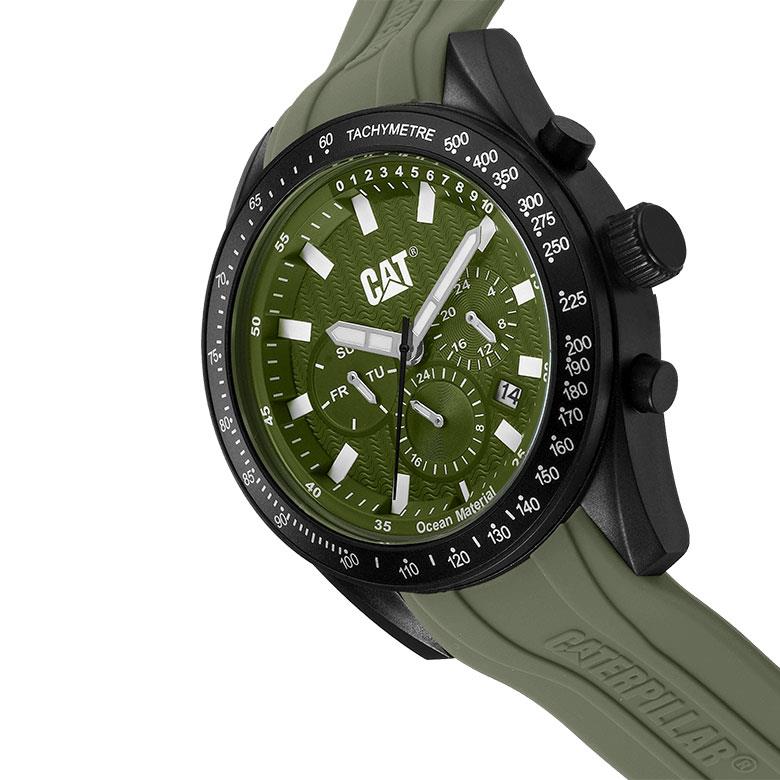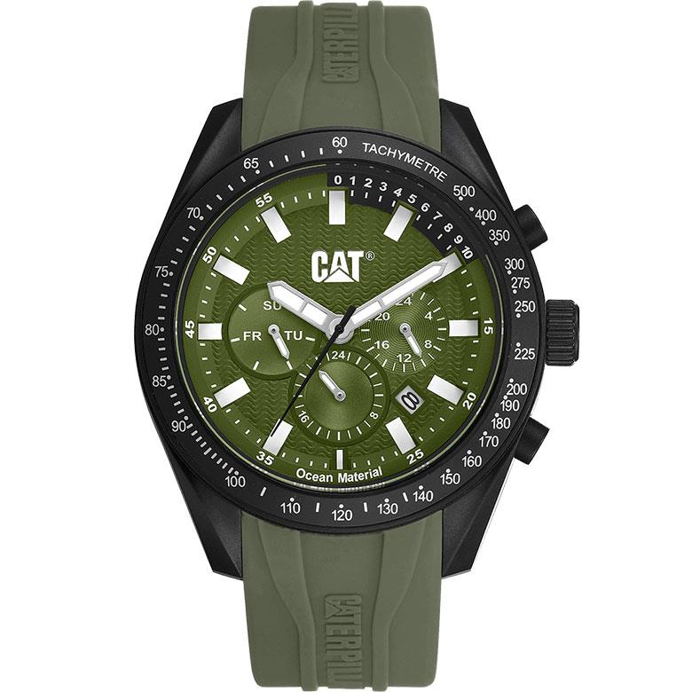 ساعت مچی مردانه کاترپیلار cat با طراحی اسپرت بند سیلیکونی سبز و قاب مشکی و صفحه گرد سبز با نمایشگرعقربه ای و قابلیت داشتن کرنوگراف /زه تاچی متر/ روز و شب / تقویم / شب نما با موتور ژاپنی و انرژی باتری و مقاوم در برابر آب تا عمق 100 متر به همراه گارانتی بین المللی