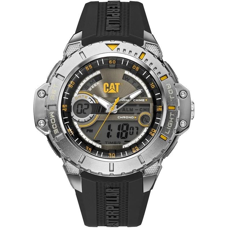 ساعت مچی مردانه کاترپیلار cat با طراحی اسپرت بند سیلیکونی مشکی و قاب استیل و صفحه گرد دورنگ با نمایشگر دیجیتالی / عقربه ای و قابلیت داشتن کرنوگراف / دو زمانه / زنگ هشدار/ روزوشب / روزهای هفته / تقویم / نورپشت صفحه/ تایمر شمارش معکوس با موتور ژاپنی و انرژی باتری و مقاوم در برابر آب تا عمق 100 متر به همراه گارانتی بین المللی