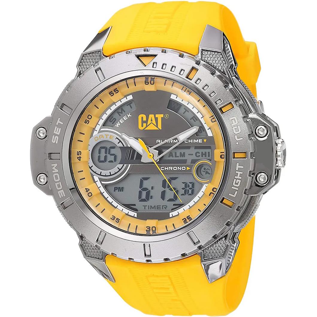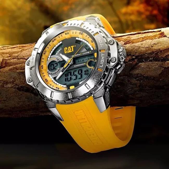ساعت مچی مردانه کاترپیلار cat با طراحی اسپرت بند سیلیکونی زرد و قاب استیل و صفحه گرد دورنگ با نمایشگر دیجیتالی / عقربه ای و قابلیت داشتن کرنوگراف / دو زمانه / زنگ هشدار/ روزوشب / روزهای هفته / تقویم / نورپشت صفحه/ تایمر شمارش معکوس با موتور ژاپنی و انرژی باتری و مقاوم در برابر آب تا عمق 100 متر به همراه گارانتی بین المللی