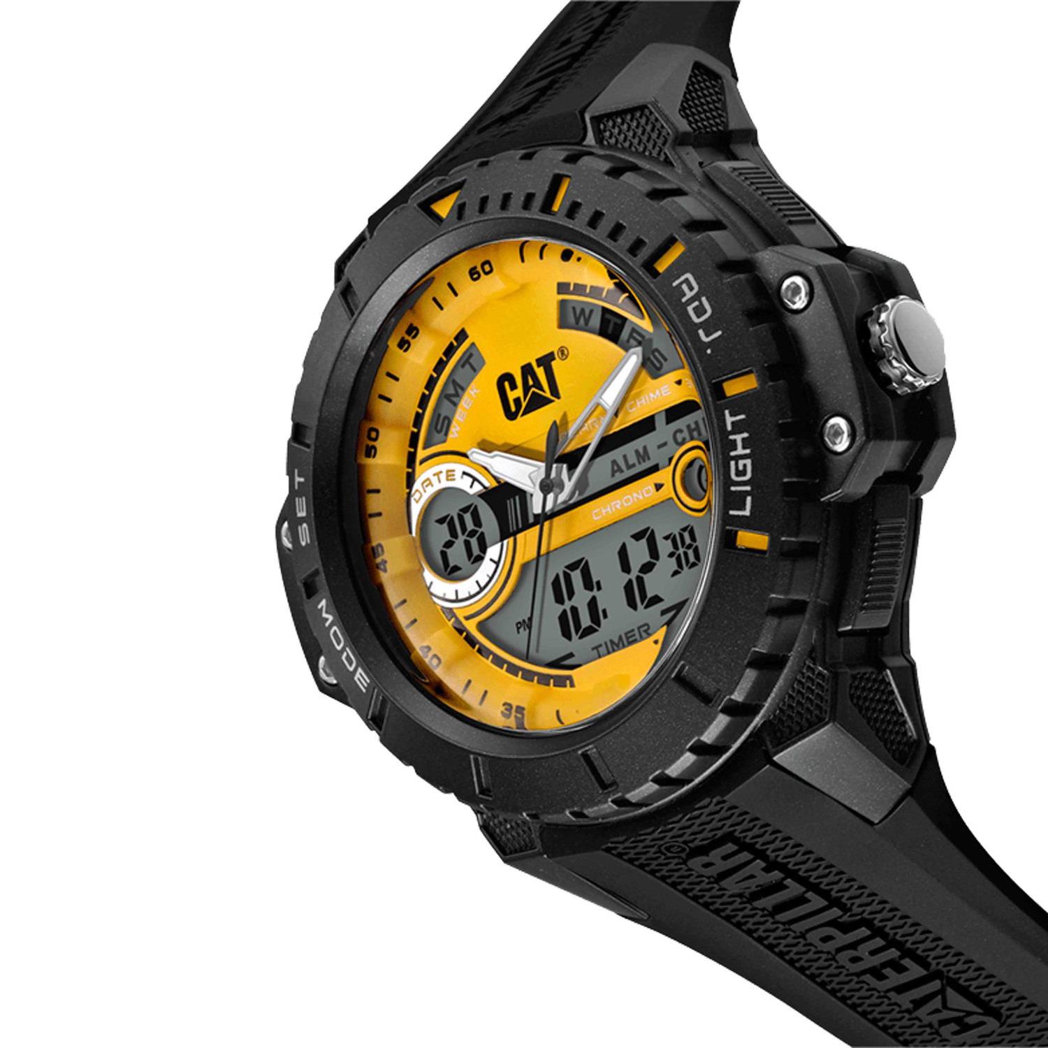 ساعت مچی مردانه کاترپیلار cat با طراحی اسپرت بند سیلیکونی مشکی و قاب مشکی و صفحه گرد دورنگ با نمایشگر دیجیتالی / عقربه ای و قابلیت داشتن کرنوگراف / دو زمانه / زنگ هشدار/ روزوشب / روزهای هفته / تقویم / نورپشت صفحه با موتور ژاپنی و انرژی باتری و مقاوم در برابر آب تا عمق 100 متر به همراه گارانتی بین المللی