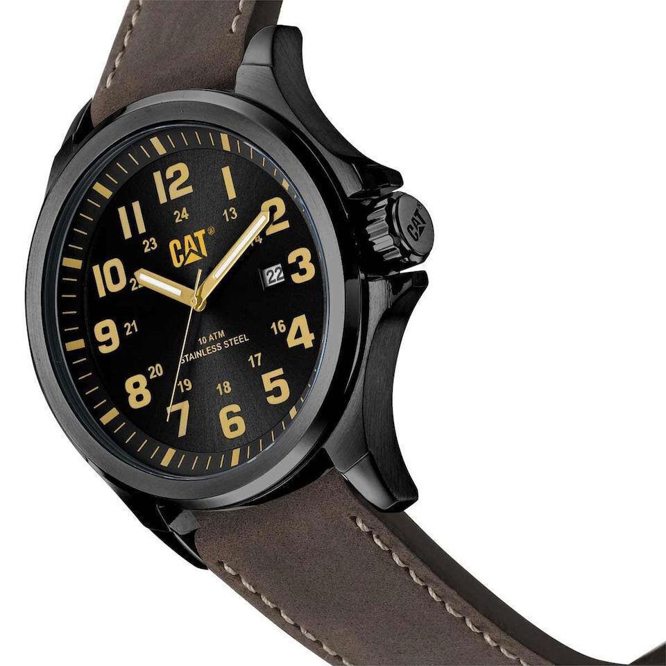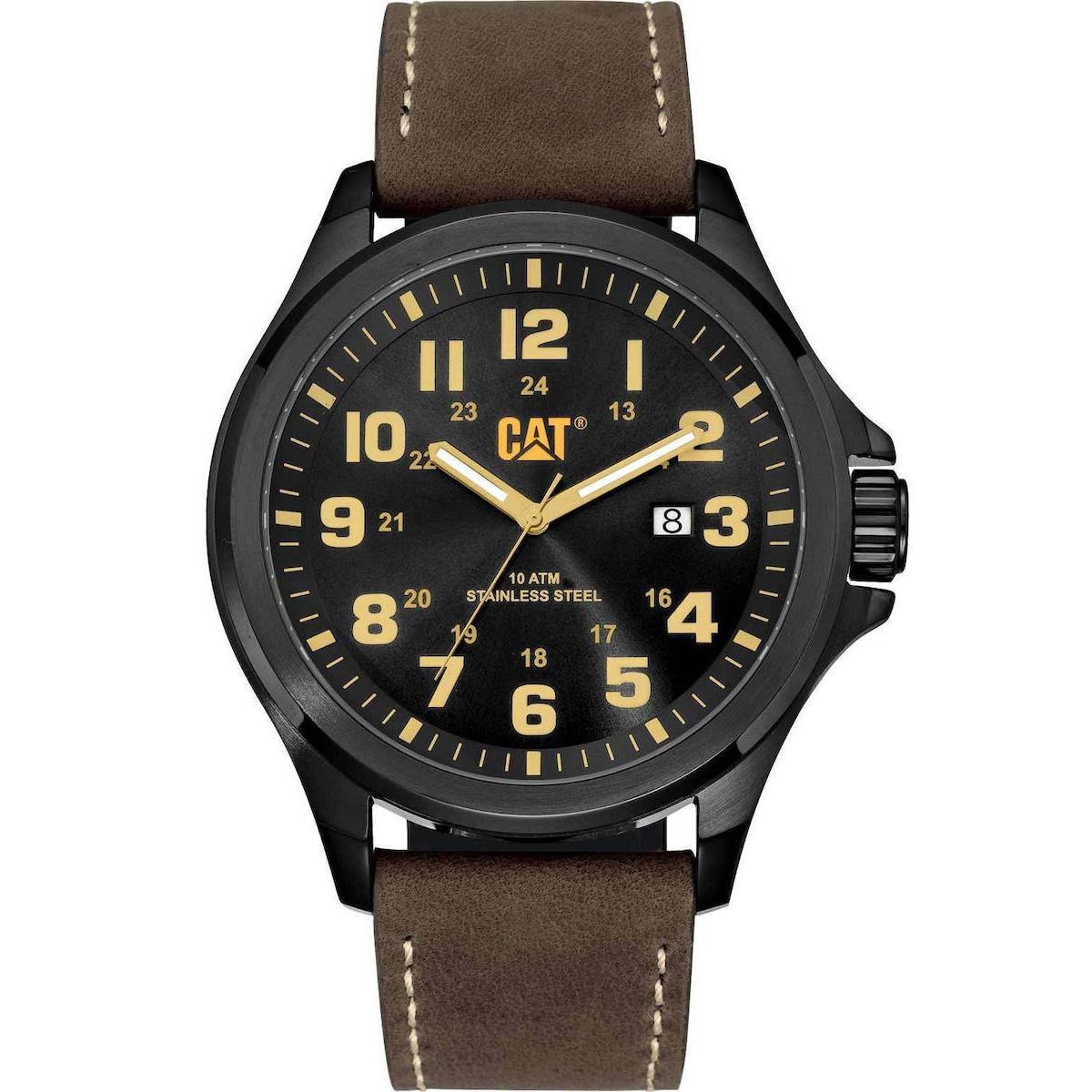 ساعت مچی مردانه کاترپیلار cat با طراحی اسپرت بند چرمی قهوه ای و قاب فلزی مشکی و صفحه گرد مشکی با قابلیت داشتن شب نما / تقویم با موتور ژاپنی و انرژی باتری و مقاوم در برابر آب تا عمق 100 متر به همراه گارانتی بین المللی