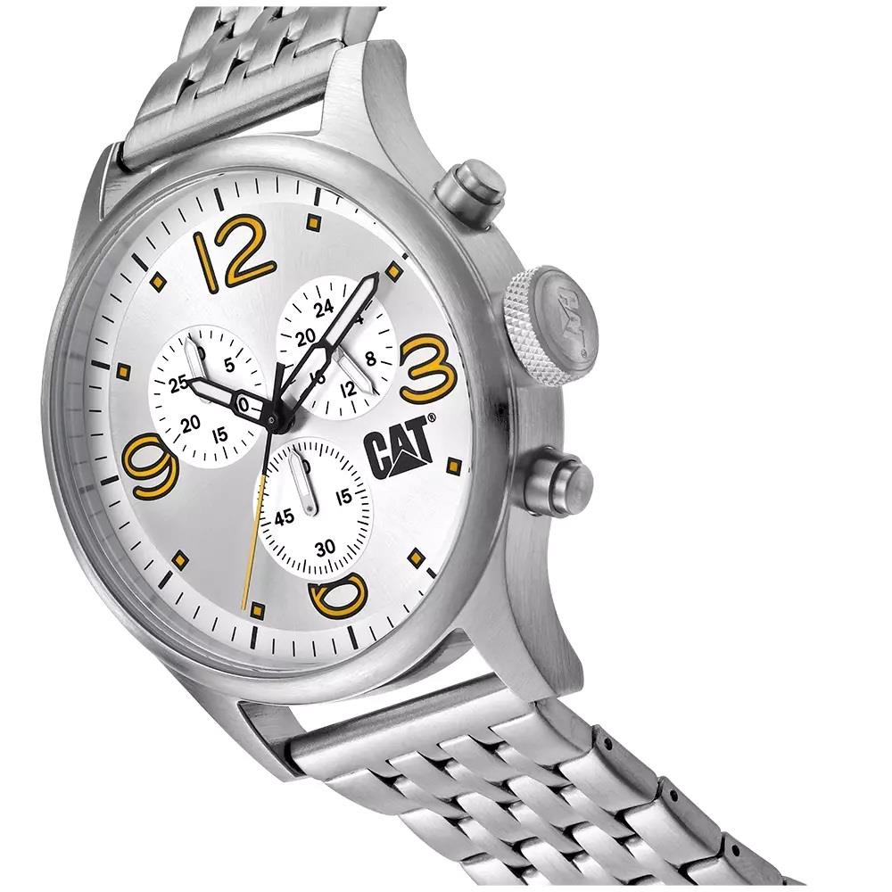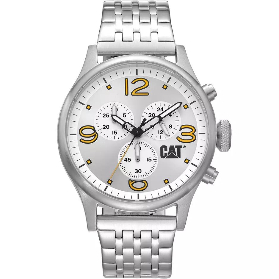 ساعت مچی مردانه کاترپیلار cat با طراحی اسپرت بند استیل و قاب استیل و صفحه گرد نقره ای با قابلیت داشتن شب نما / کرنوگراف / روز و شب با موتور ژاپنی و انرژی باتری و مقاوم در برابر آب تا عمق 100 متر به همراه گارانتی بین المللی