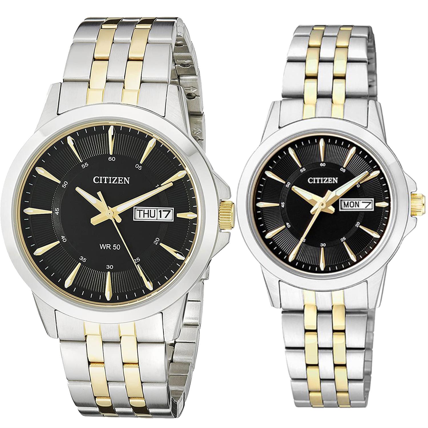 ساعت ست مردانه و زنانه سیتیزن citizen با طراحی کلاسیک بند استیل طلایی و قاب طلایی استیل و صفحه گرد مشکی با قابلیت داشتن تقویم / شب نما / روزهای هفته و موتور ژاپنی با انرژی باتری و مقاوم در برابر آب تا عمق 50 متر به همراه گارانتی بین المللی