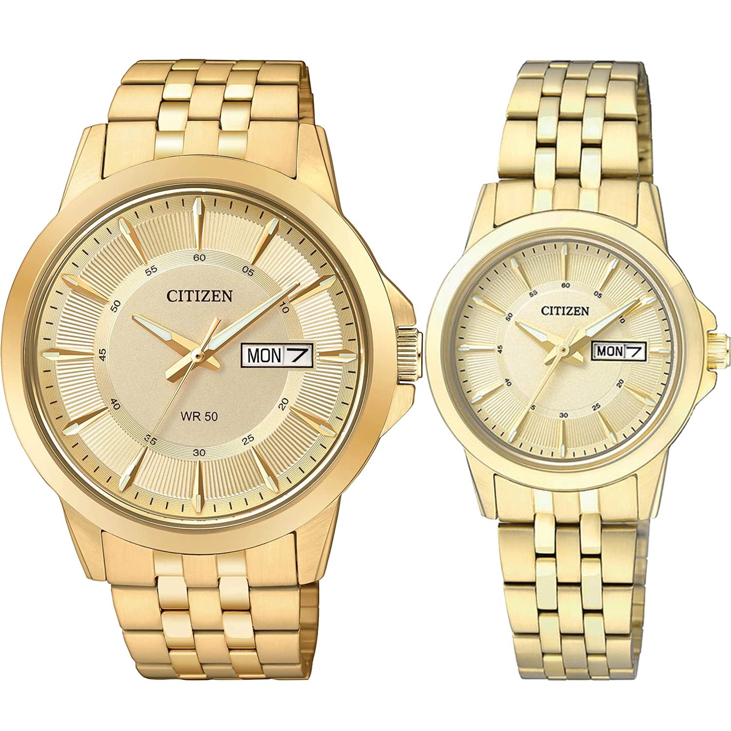 ساعت ست مردانه و زنانه سیتیزن citizen با طراحی کلاسیک بند فلزی طلایی و قاب فلزی طلایی و صفحه گرد طلایی با قابلیت داشتن تقویم / شب نما / روزهای هفته و موتور ژاپنی با انرژی باتری و مقاوم در برابر آب تا عمق 50 متر به همراه گارانتی بین المللی