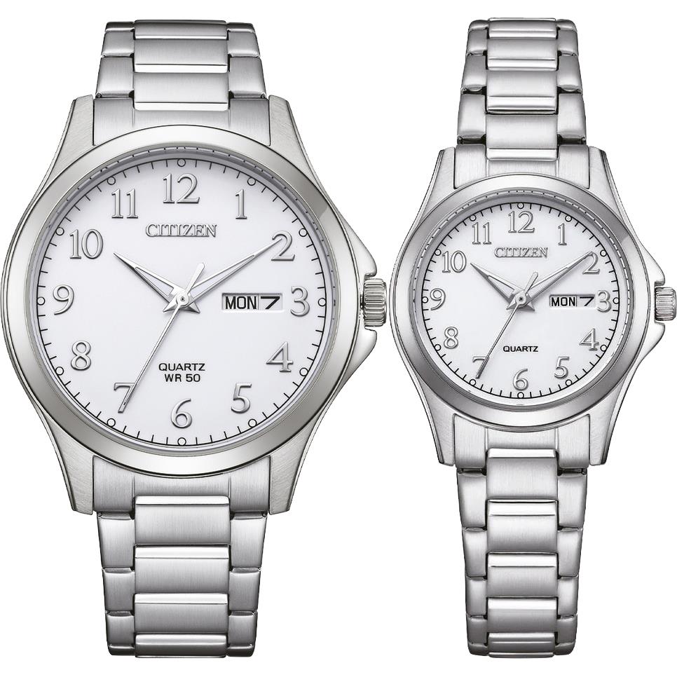 ساعت ست مردانه و زنانه سیتیزن citizen با طراحی کلاسیک بند استیل وقاب استیل و صفحه گرد سفید با قابلیت داشتن تقویم / شب نما / روزهای هفته و موتور ژاپنی با انرژی باتری و مقاوم در برابر آب تا عمق 50 متر به همراه گارانتی بین المللی