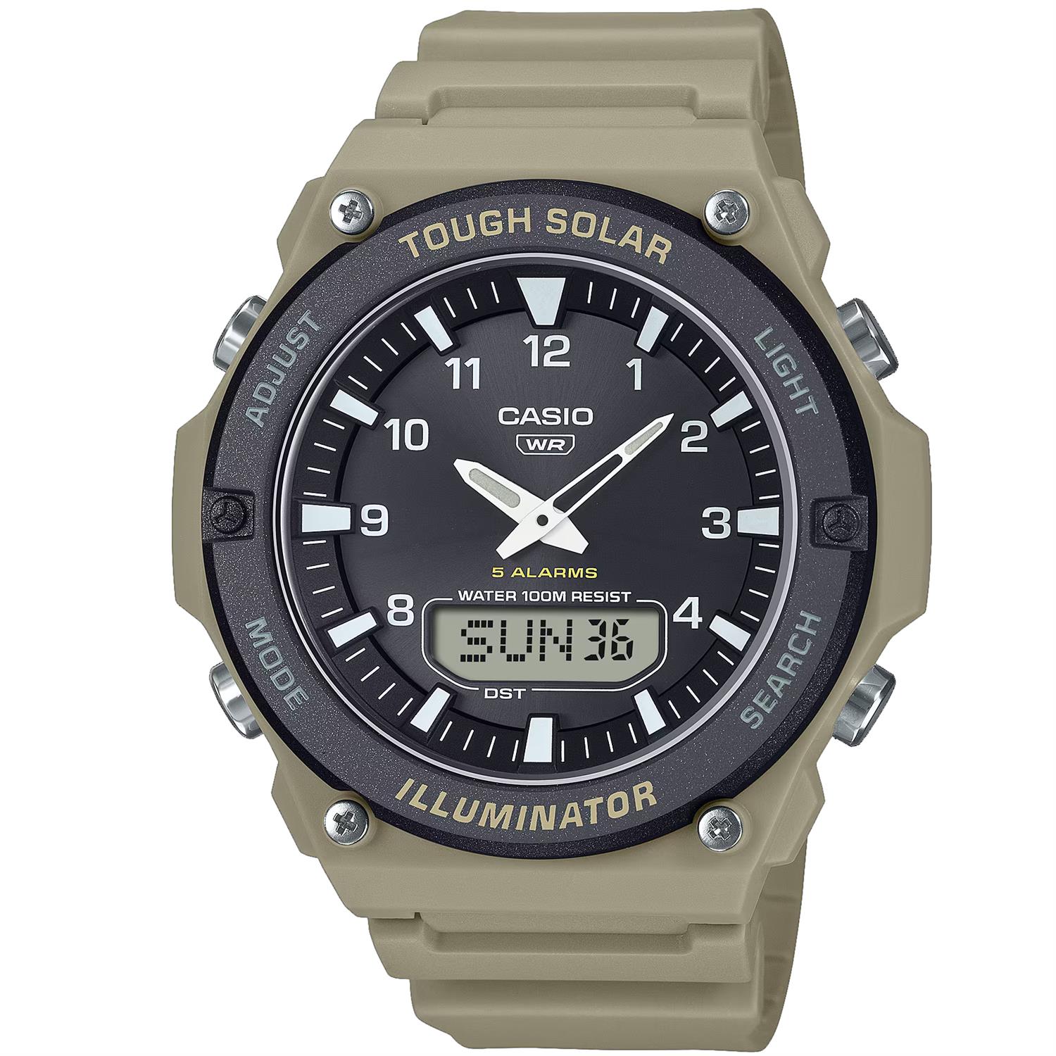 ساعت مچی مردانه کاسیو casio با طراحی روزانه بند سیلیکونی با قاب گرد مشکی و صفحه گرد مشکی با نمایشگر دیجیتالی / عقربه ای و قابلیت داشتن تقویم / شبنما / روز و شب / روزهای هفته / کرنوگراف / تایمر شمارش معکوس/ نورپشت صفحه / ساعت کشورها / شاخص انرژِ ذخیره شده و موتور ژاپنی با انرژی خورشیدی و مقاوم در برابر آب تا عمق 100 متر به همراه گارانتی بین المللی