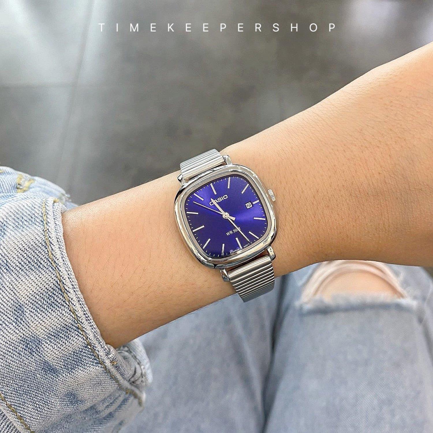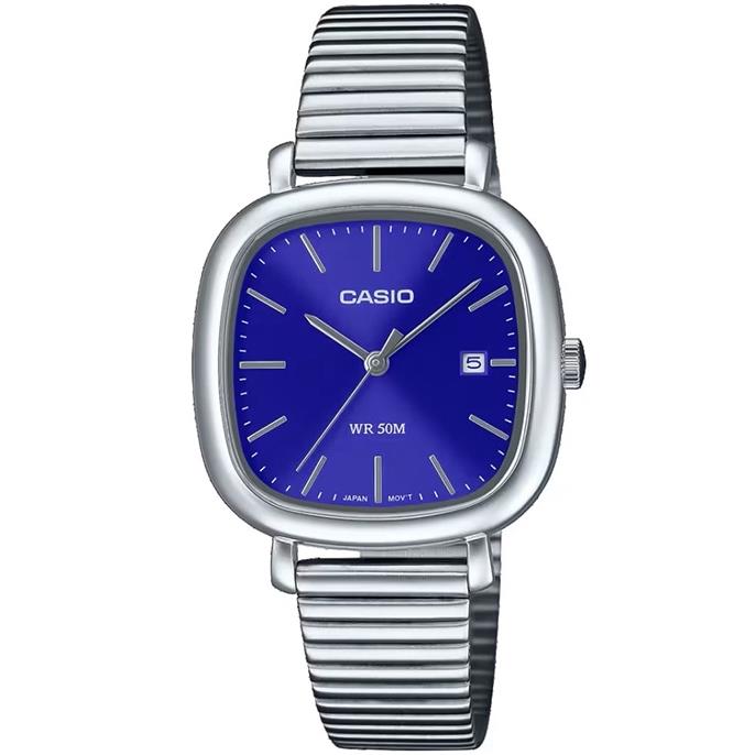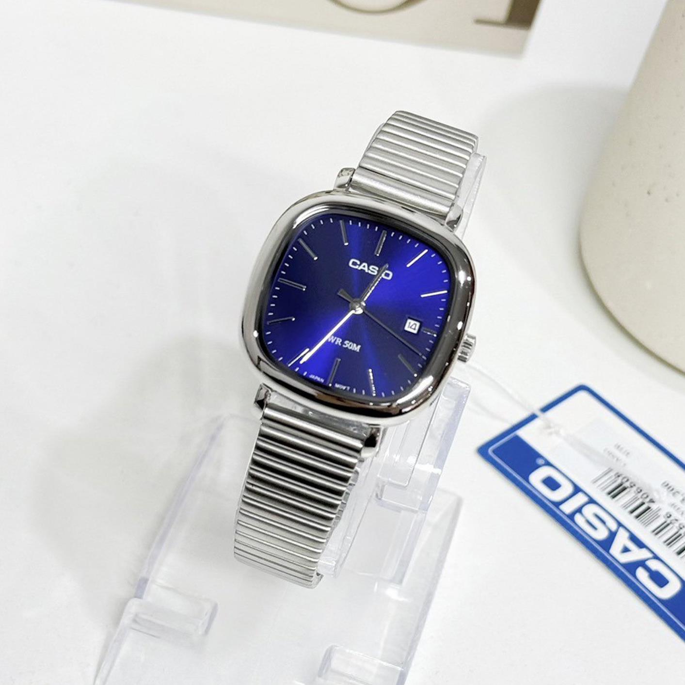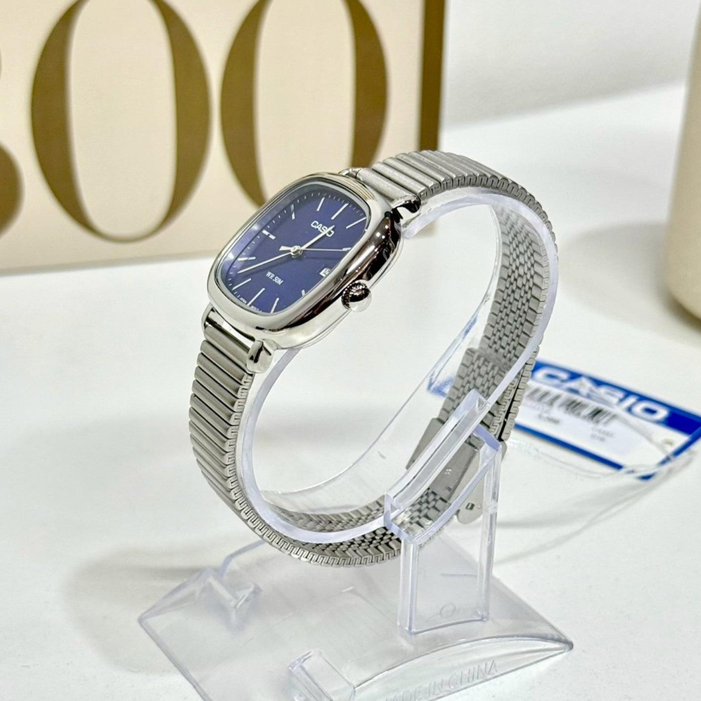 ساعت مچی زنانه کاسیو casio با طراحی روزانه بند استیل با قاب مربعی شکل استیل و صفحه سرمه ای با قابلیت داشتن تقویم و موتور ژاپنی با انرژی باتری و مقاوم در برابر آب تا عمق 50 متر به همراه گارانتی بین المللی