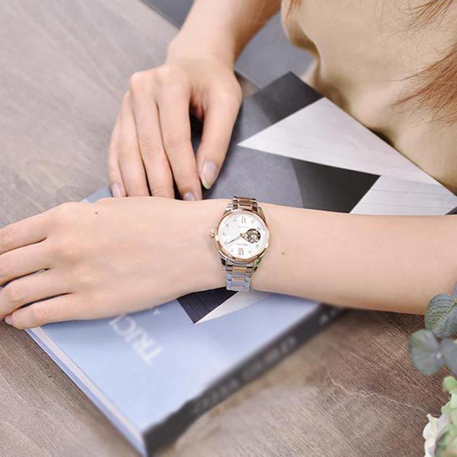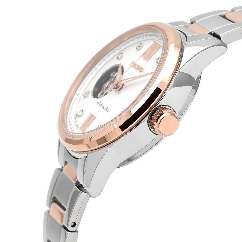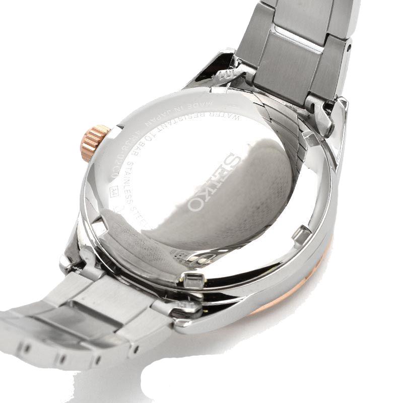ساعت مچی زنانه سیکو seiko با طراحی روزانه بند استیل مسی, قاب گرد مسی استیل و صفحه قلب باز نقره ای و شیشه ضدخراش با قابلیت داشتن شب نما و موتوراتوماتیک ژاپنی با انرژی مکانیکی و مقاوم در برابر آب تا عمق 100 متر به همراه گارانتی بین المللی