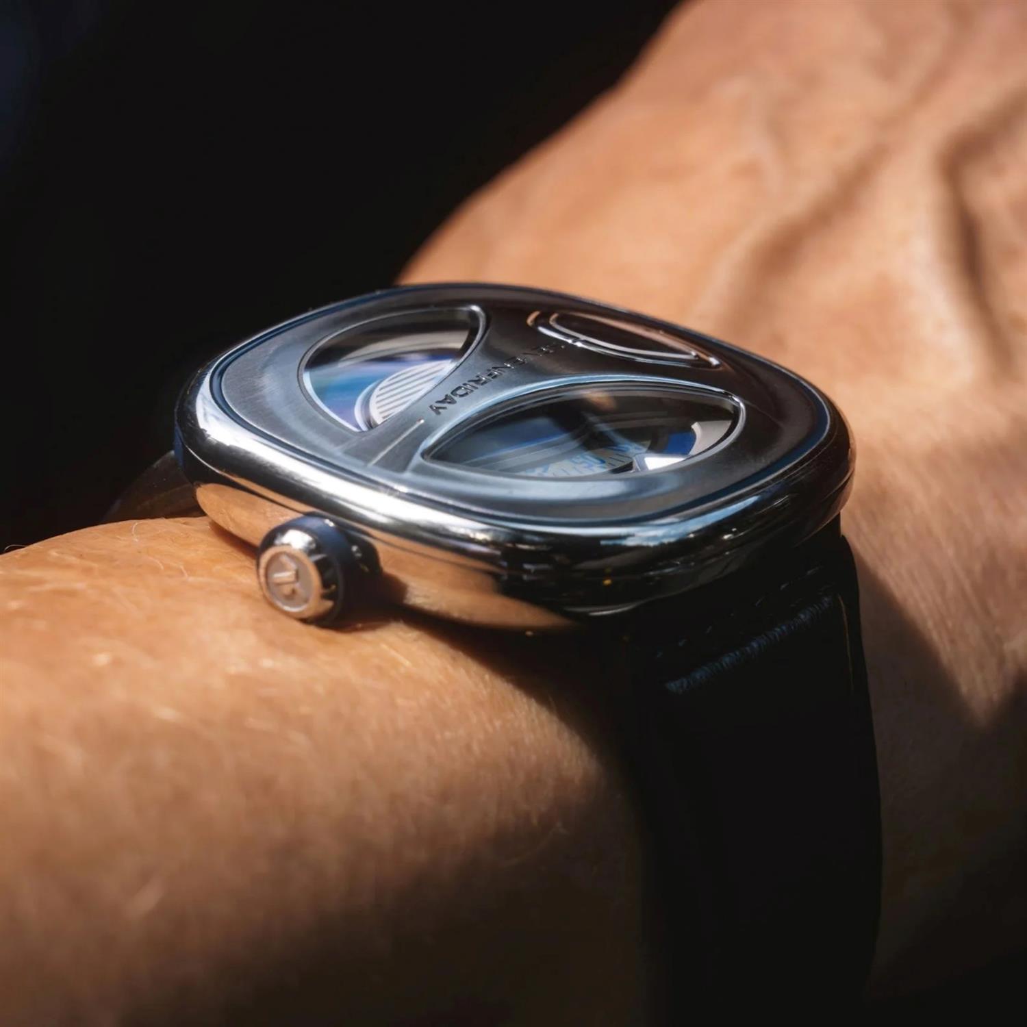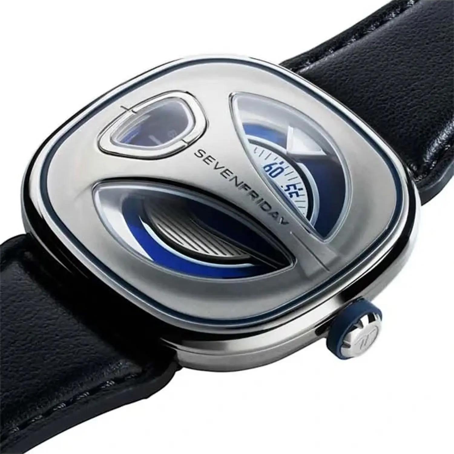 ساعت مچی مردانه سون فرایدی sevenfriday با طراحی اسپرت بند چرمی مشکی, قاب مربع استیل و صفحه مربعی دو رنگ با شیشه ضد خراش و ضد انعکاس نور و موتور اتوماتیک ژاپنی با انرژی مکانیکی و مقاومت در برابر آب تا عمق 50 متر به همراه دو سال گارانتی بین المللی