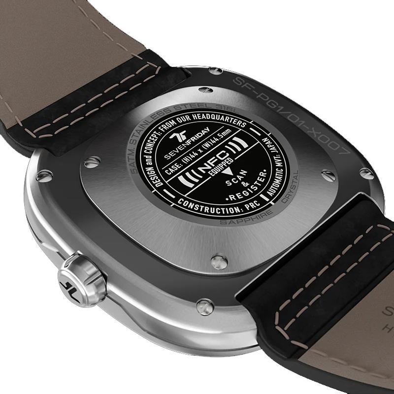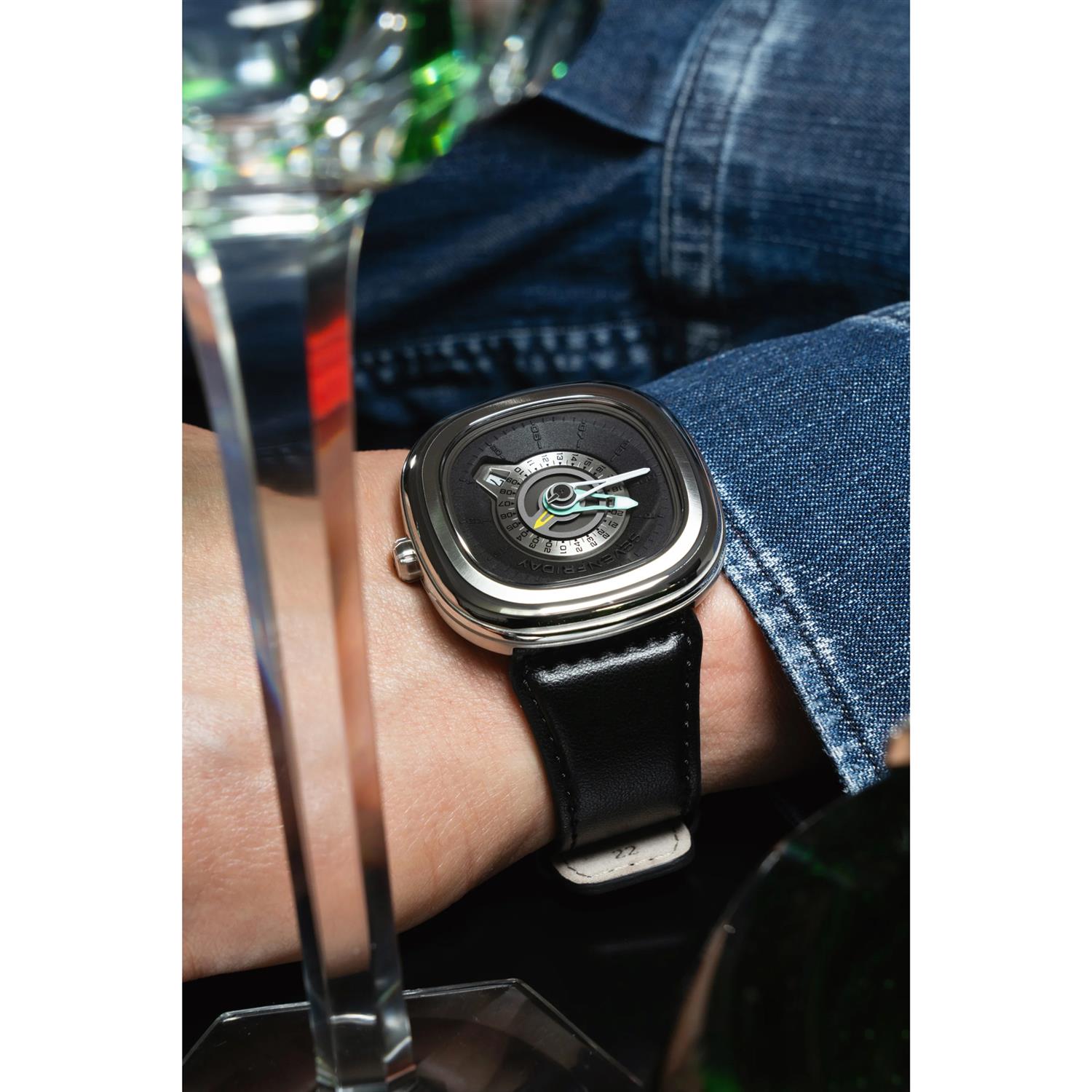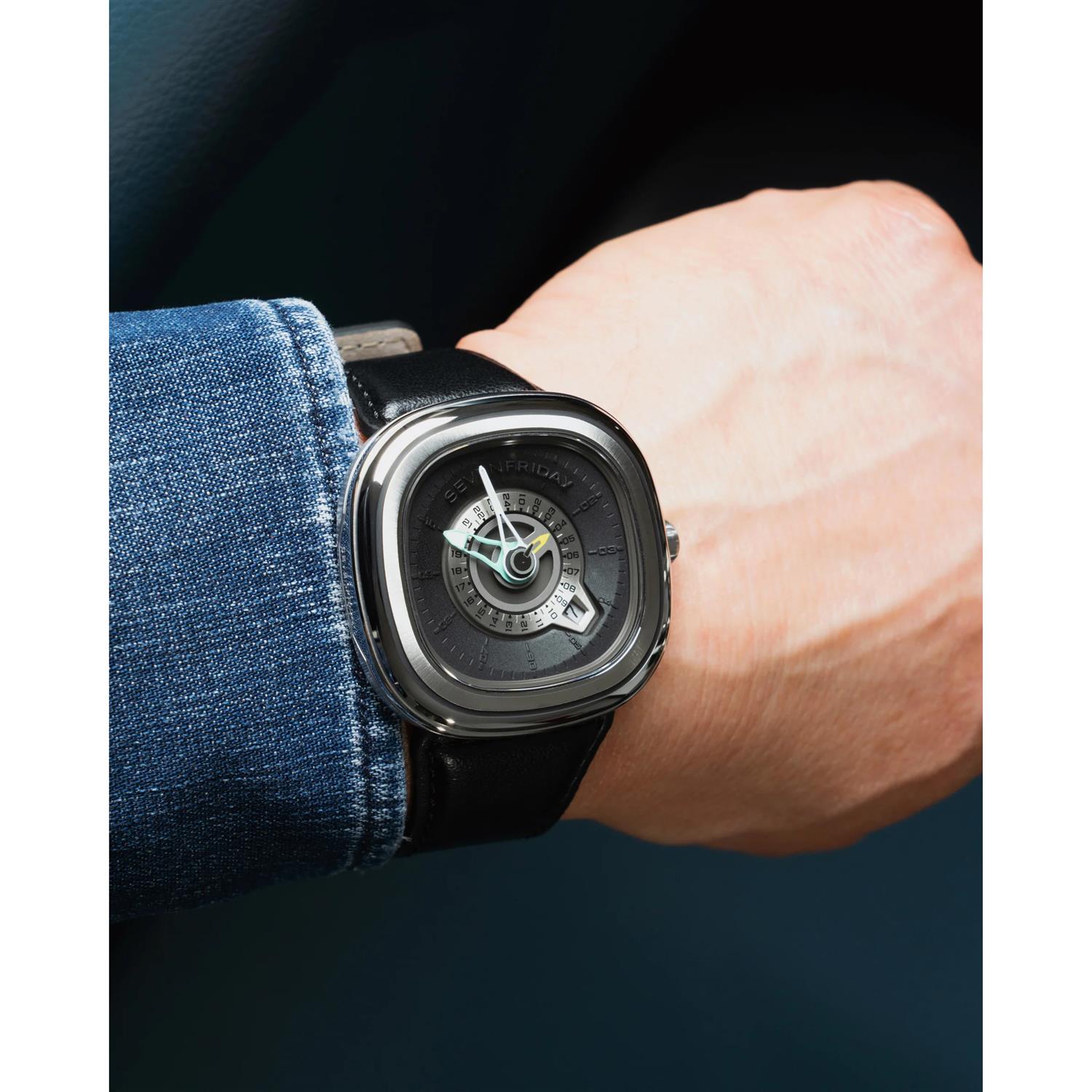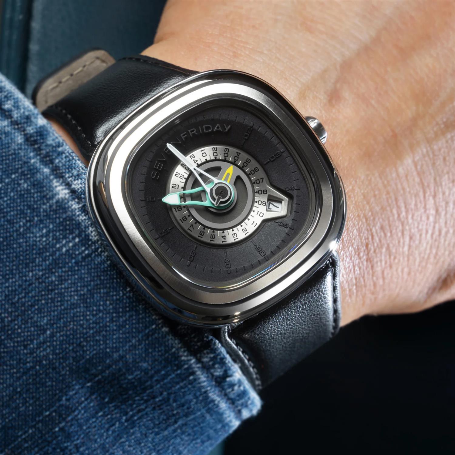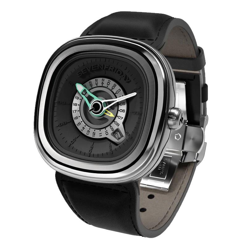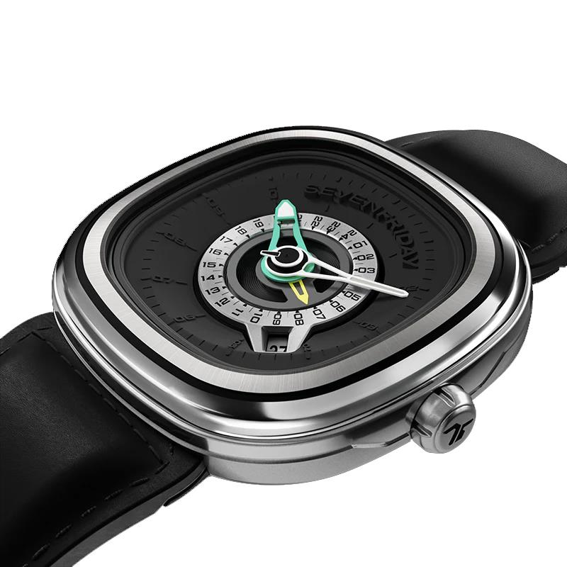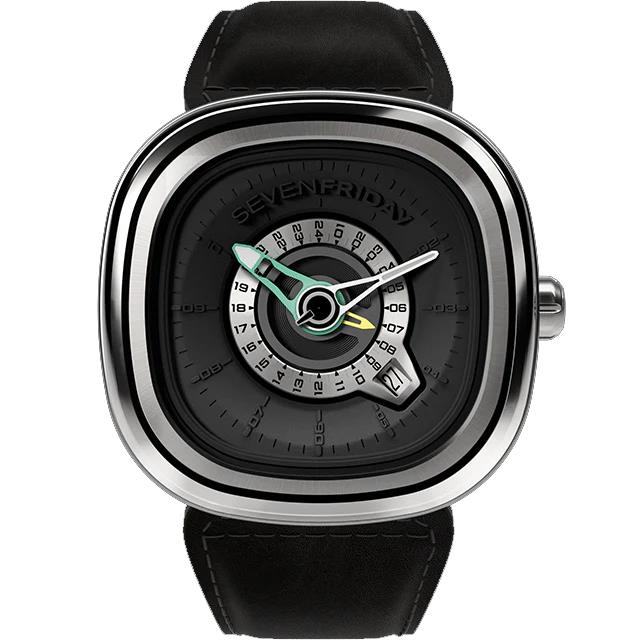 ساعت مچی مردانه سون فرایدی sevenfriday با طراحی اسپرت بند چرمی مشکی ,قاب مربع استیل و صفحه مربعی مشکی با شیشه ضد خراش و قابلیت داشتن شب نما / تقویم  و موتور اتوماتیک ژاپنی با انرژی مکانیکی و مقاومت در برابر آب تا عمق 50 متر به همراه دو سال گارانتی بین المللی