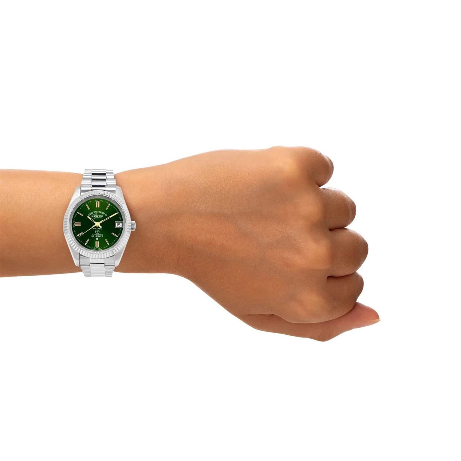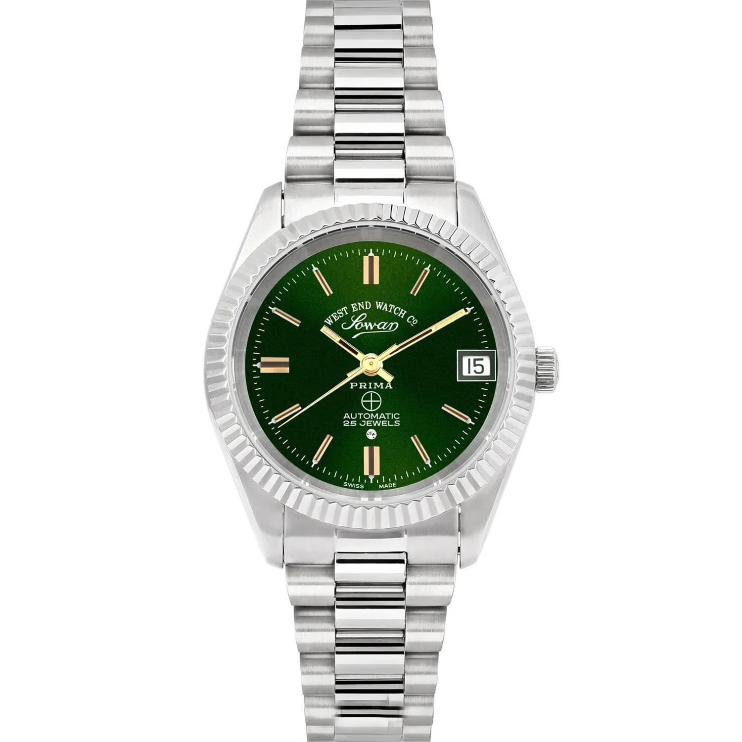 ساعت مچی زنانه  وست اند واچ westendwatch با طراحی روزانه بند استیل و قاب استیل و صفحه نگین دار سبز با شیشه ضد خراش و قابلیت داشتن تقویم / شب نما و موتوراتوماتیک سوییسی با انرژی مکانیکی و مقاوم در برابر آب تا عمق 50 متر به همراه گارانتی بین المللی