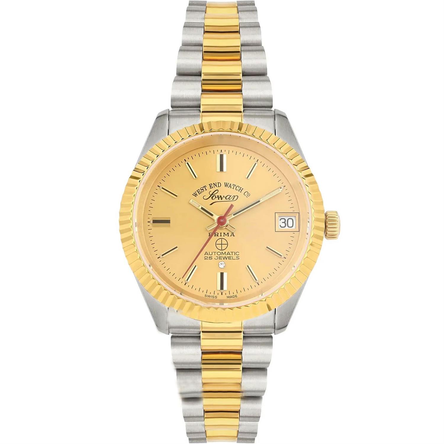 ساعت مچی زنانه  وست اند واچ westendwatch با طراحی روزانه بند استیل طلایی و قاب طلایی استیل و صفحه نگین دار طلایی با شیشه ضد خراش و قابلیت داشتن تقویم / شب نما و موتوراتوماتیک سوییسی با انرژی مکانیکی و مقاوم در برابر آب تا عمق 50 متر به همراه گارانتی بین المللی