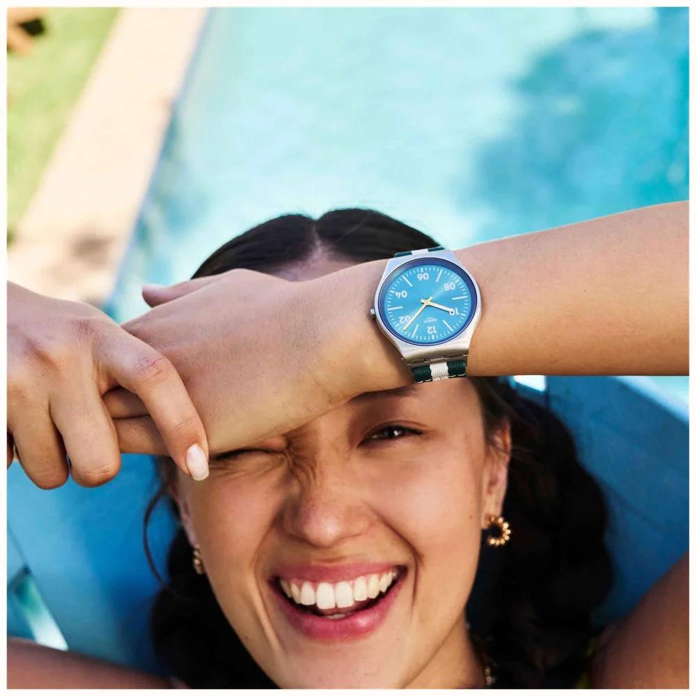 ساعت مچی مردانه / زنانه سواچ SWATCH با طراحی روزانه بند برزنتی دورنگ و قاب گرد استیل و صفحه گرد سبز با موتور سوییسی و انرژی باتری با قابلیت داشتن شبنما و مقاوم در برابر آب تا عمق 30 متر به همراه دو سال گارانتی بین المللی