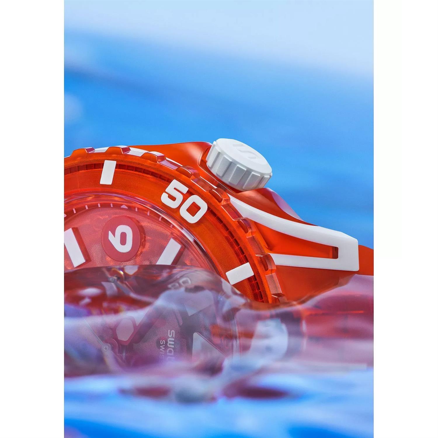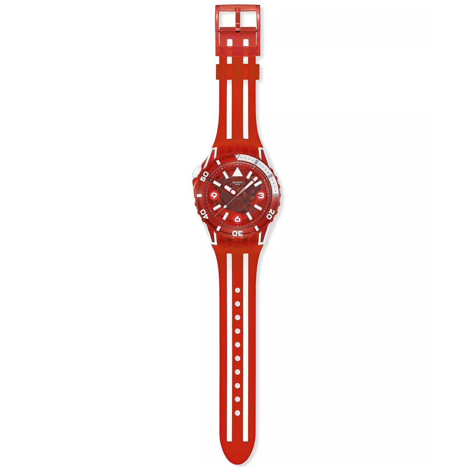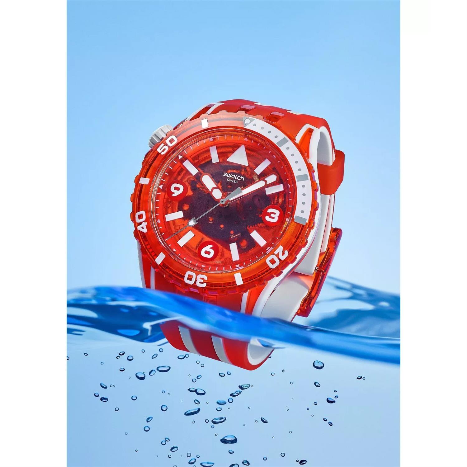 ساعت مچی مردانه / زنانه سواچ SWATCH با طراحی روزانه بند سیلیکونی دورنگ و قاب گرد دورنگ و صفحه اسکلتون قرمزبا قابلیت داشتن صفحه اسکلتون / شب نما وموتورسوییسی و انرژی باتری با قابلیت داشتن شبنما و مقاوم در برابر آب تا عمق 100 متر به همراه دو سال گارانتی بین المللی