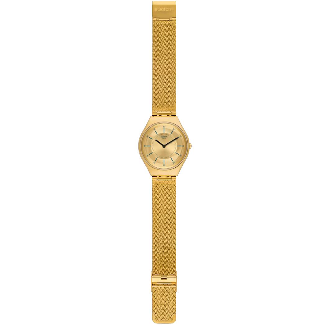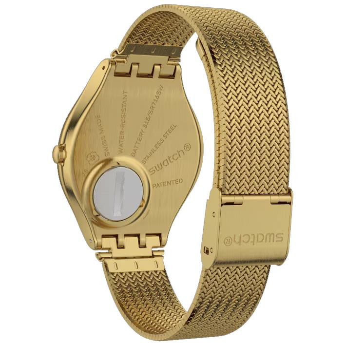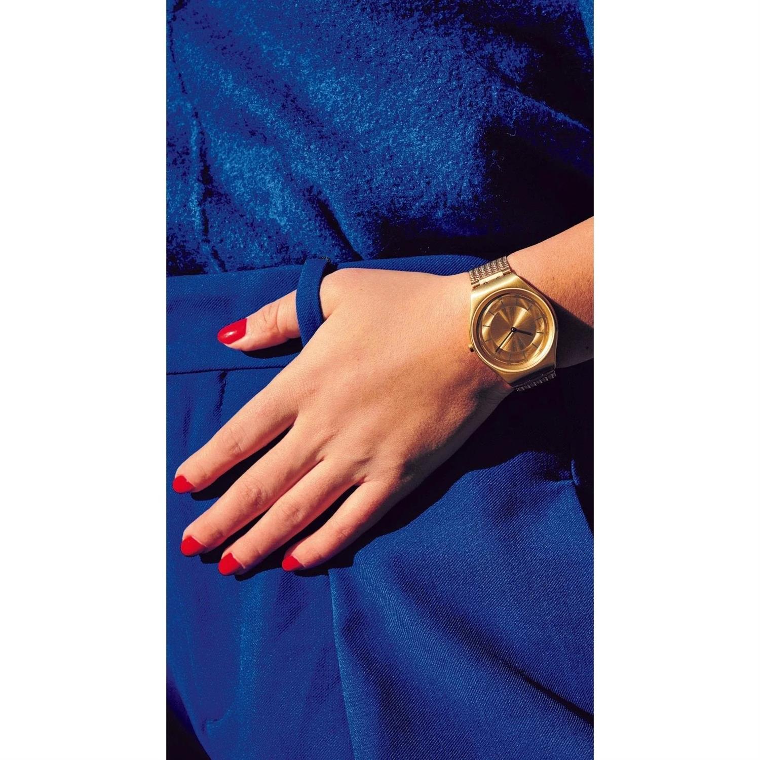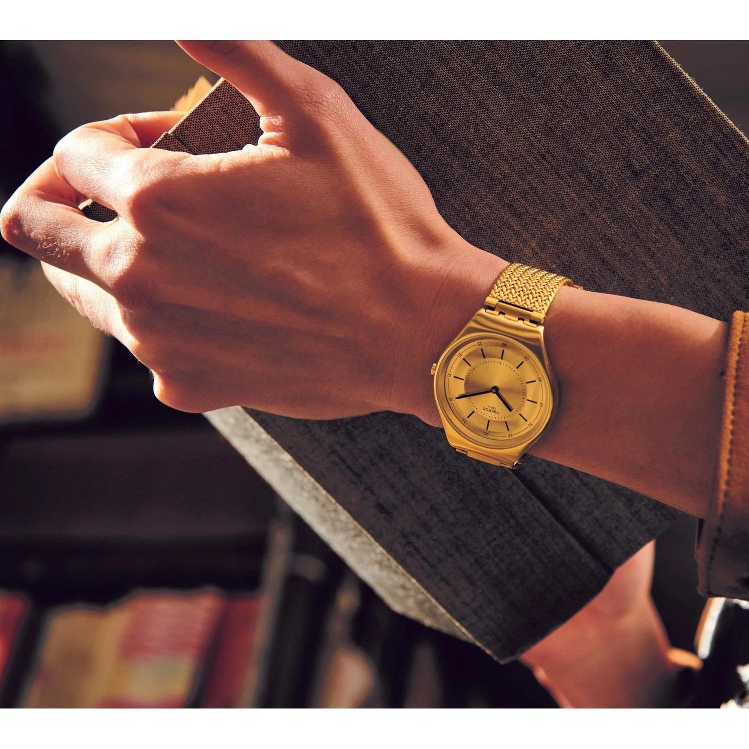 ساعت مچی زنانه / مردانه سواچ swatch با طراحی روزانه بند حصیربافت طلایی و قاب طلایی با صفحه طلایی و موتور سوییسی با انرژی باطری و مقاوم در برابر آب تا عمق 30 متر به همراه گارانتی بین المللی