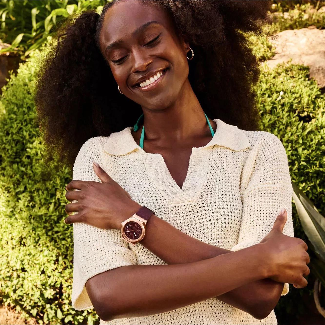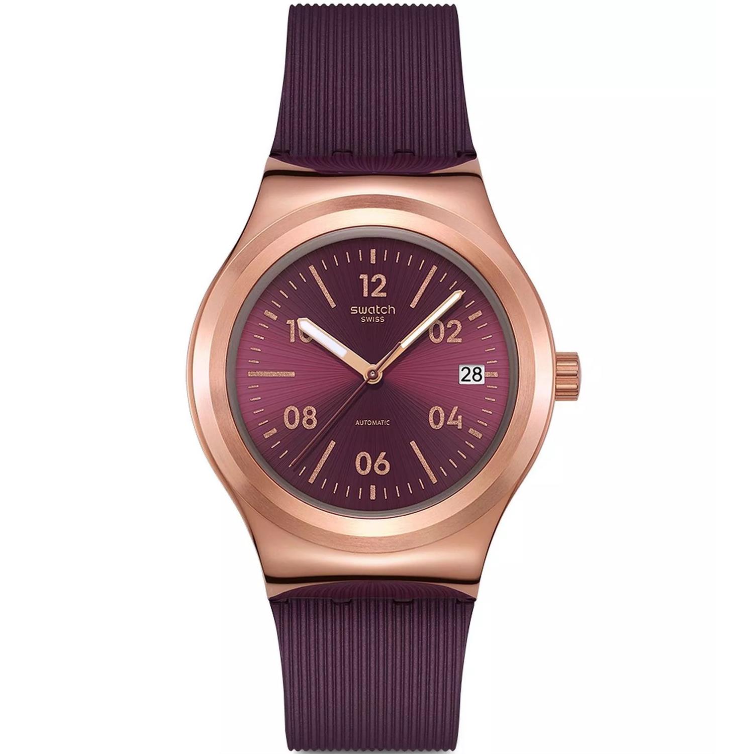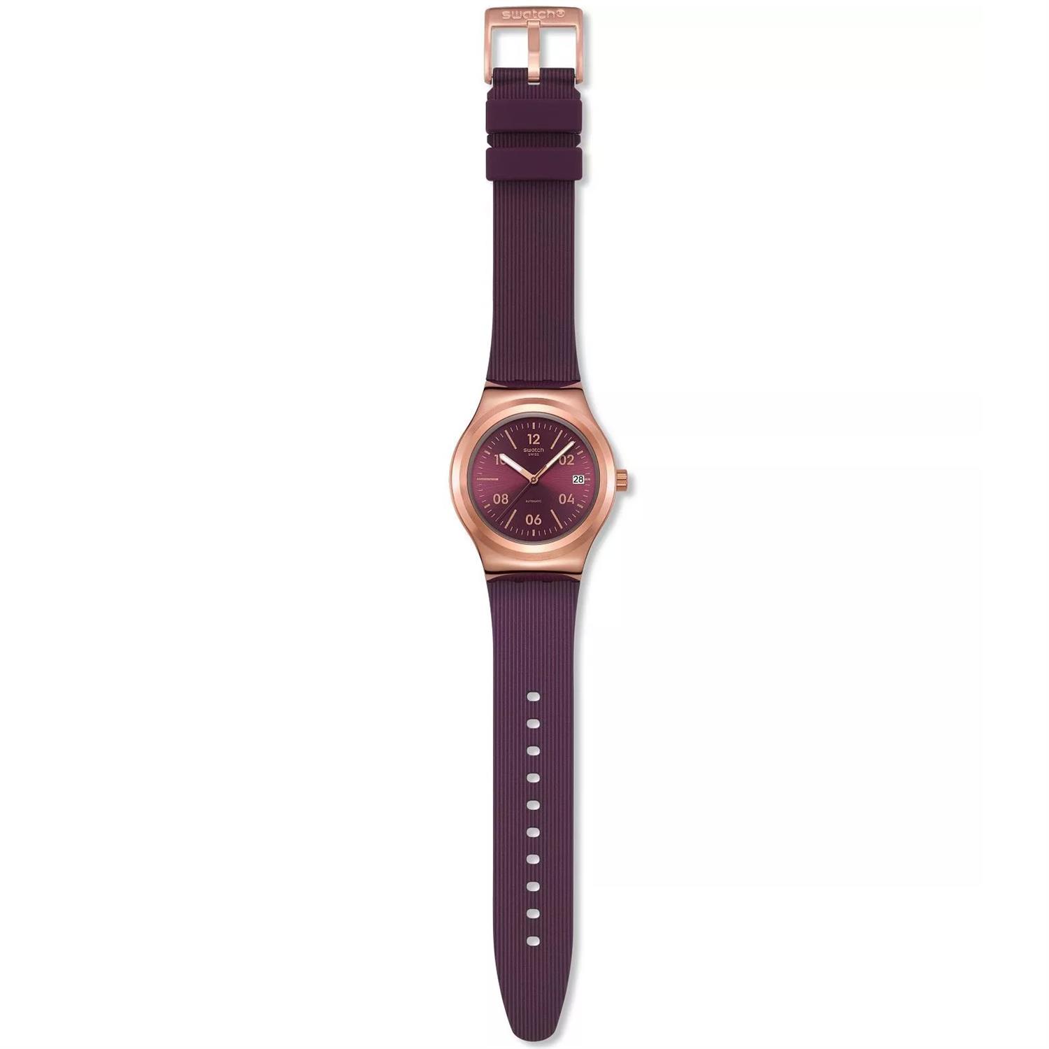 ساعت مچی مردانه / زنانه سواچ SWATCH با طراحی روزانه بند سیلیکونی بنفش و قاب گرد فلزی مسی و صفحه گرد بنفش با موتوراتوماتیک سوییسی و انرژی مکانیکی با قابلیت داشتن تقویم / شبنما و مقاوم در برابر آب تا عمق 30 متر به همراه دو سال گارانتی بین المللی