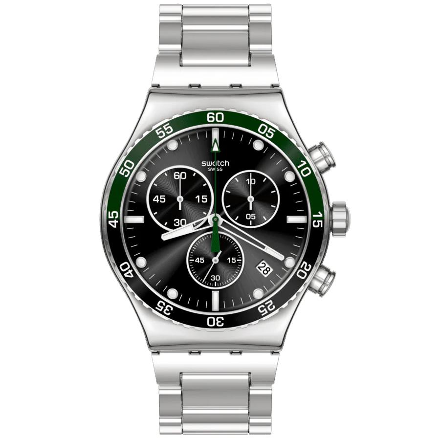 ساعت مچی مردانه / زنانه سواچ SWATCH با طراحی روزانه بند استیل و قاب گرد دور نگ و صفحه گرد مشکی با موتور سوییسی و انرژی باتری با قابلیت داشتن تقویم / شبنما کرنوگراف و مقاوم در برابر آب تا عمق 30 متر به همراه دو سال گارانتی بین المللی