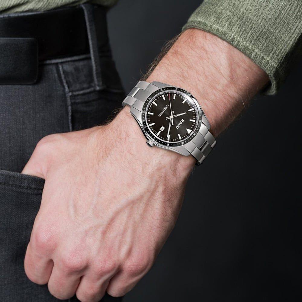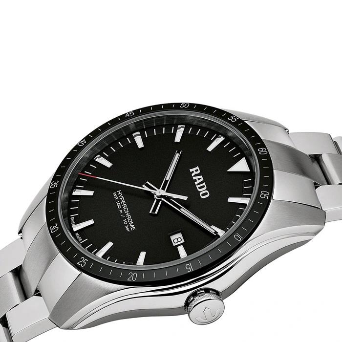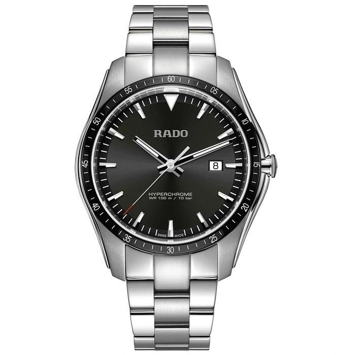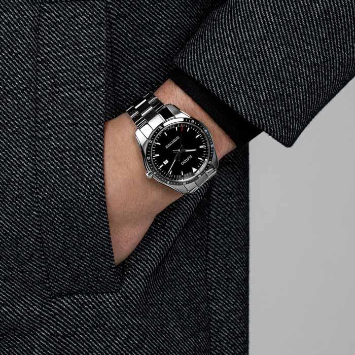 ساعت مچی مردانه رادو RADO با طراحی روزانه بند استیل با قفل کلیپسی و قاب گرد سرامیک /استیل و صفحه مشکی با قابلیت داشتن تقویم/ شب نما و موتور سوییسی با انرژی باتری و مقاوم در برابر آب تا عمق 100متر به همراه گارانتی بین المللی