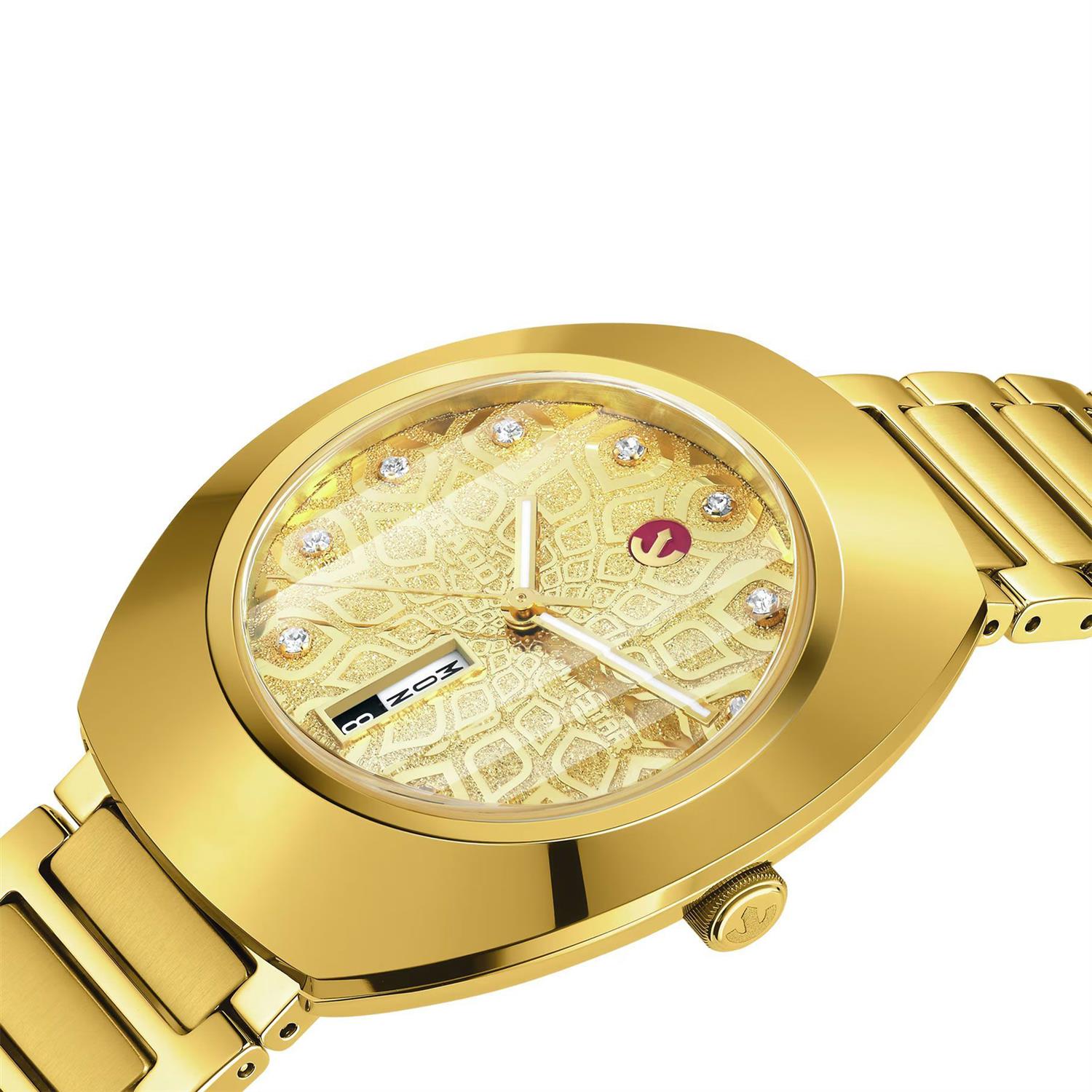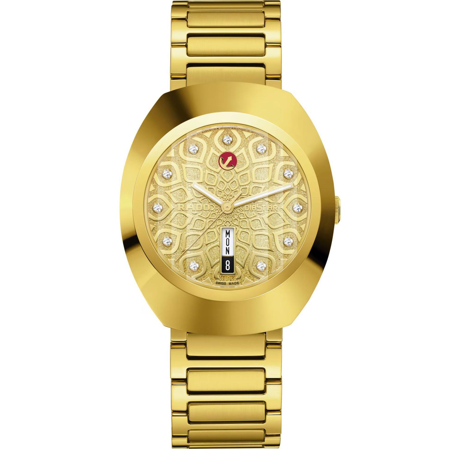 ساعت مچی مردانه رادو RADO با طراحی روزانه بند فلزی طلایی با قفل کلیپسی و قاب بیضی طلایی و صفحه نگین دار طلایی با شیشه ضد خراش و قابلیت داشتن تقویم / روزهای هفته/ شب نما و موتوراتوماتیک سوییسی با انرژی مکانیکی و مقاوم در برابر آب تا عمق 100 متربه همراه گارانتی بین المللی