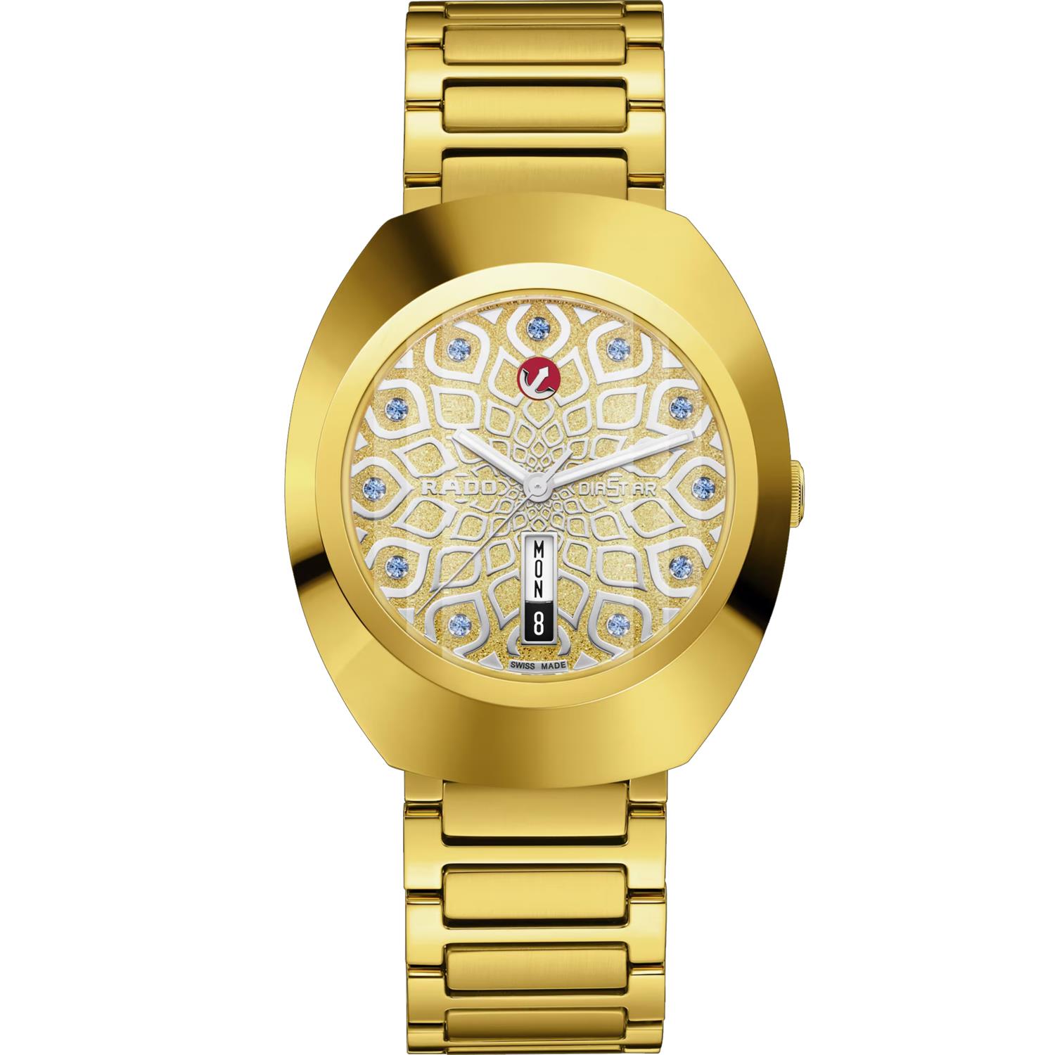ساعت مچی مردانه رادو RADO با طراحی روزانه بند فلزی طلایی با قفل کلیپسی و قاب بیضی طلایی و صفحه نگین دار چند رنگ با شیشه ضد خراش و قابلیت داشتن تقویم / روزهای هفته/ شب نما و موتوراتوماتیک سوییسی با انرژی مکانیکی و مقاوم در برابر آب تا عمق 100 متربه همراه گارانتی بین المللی