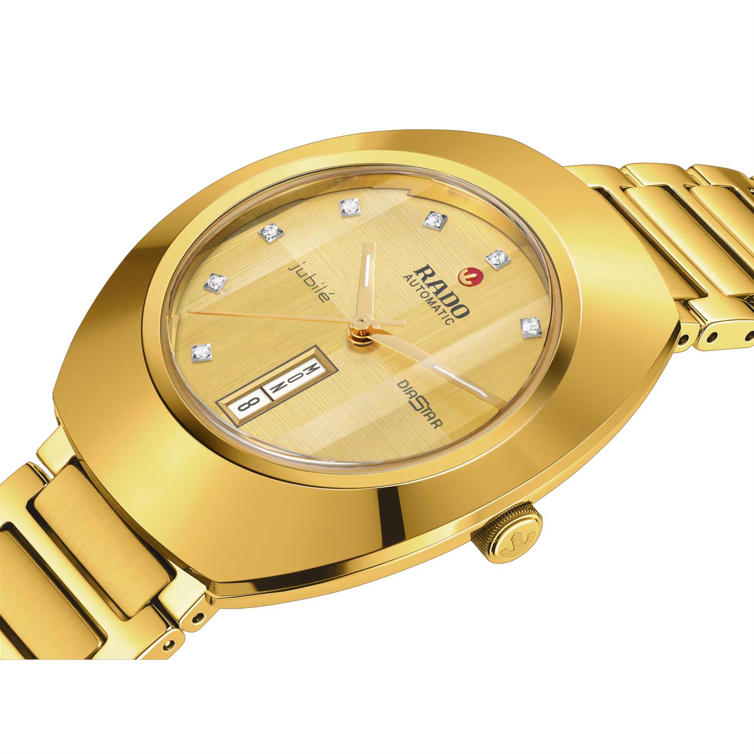 ساعت مچی مردانه رادو RADO با طراحی روزانه بند فلزی طلایی با قفل کلیپسی و قاب متفاوت طلایی و صفحه نگین دار طلایی با قابلیت داشتن تقویم / روزهای هفته/ شب نما و موتور اتوماتیک سوییسی با انرژی مکانیکی و مقاوم در برابر آب تا عمق 50 متربه همراه گارانتی بین المللی