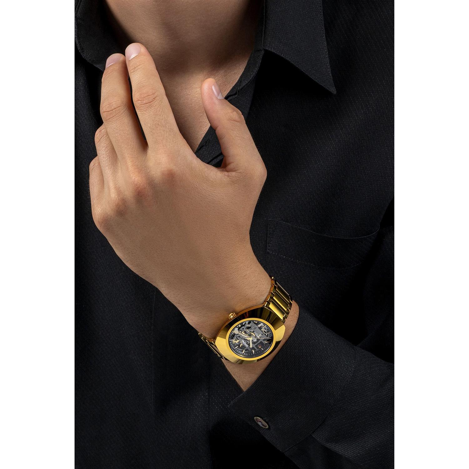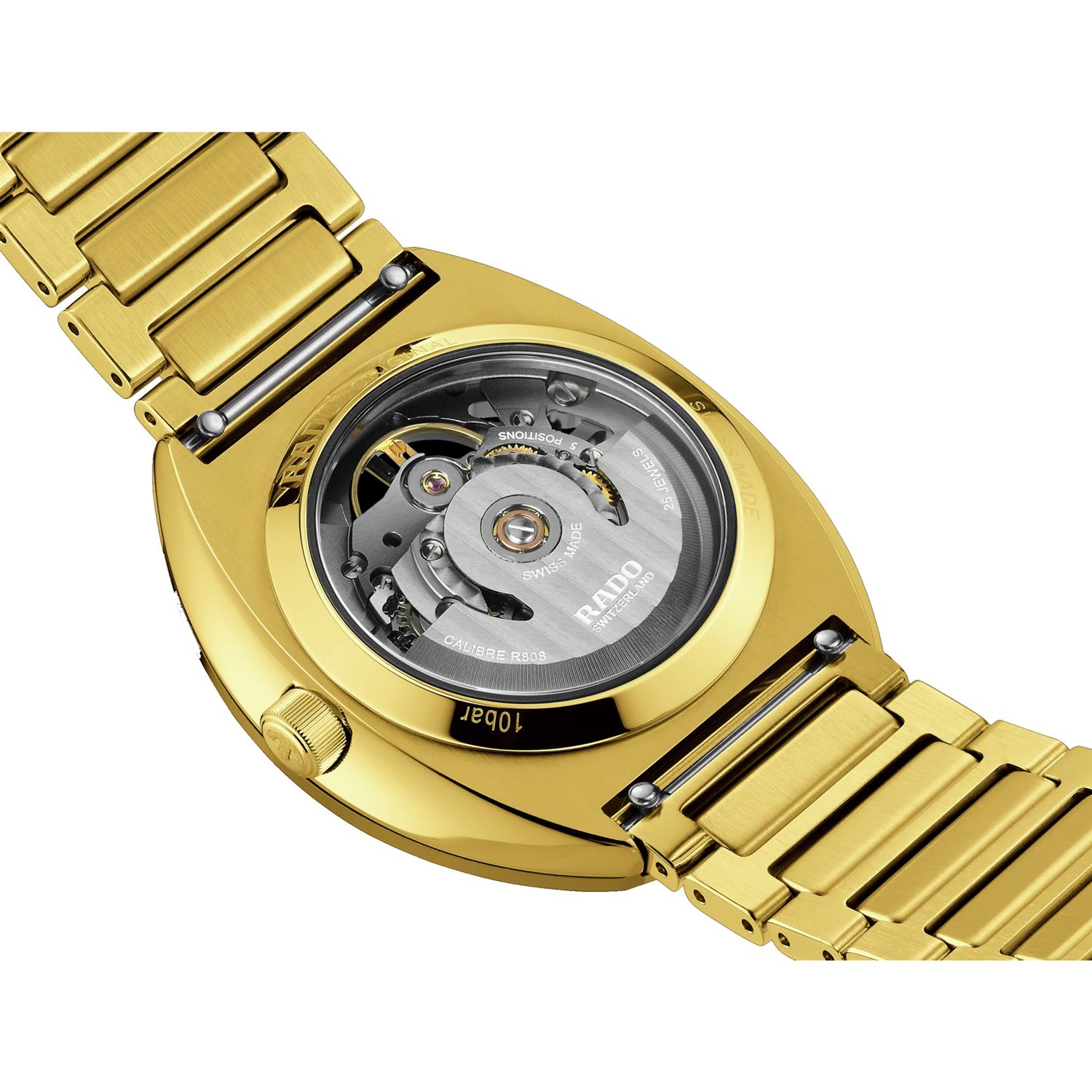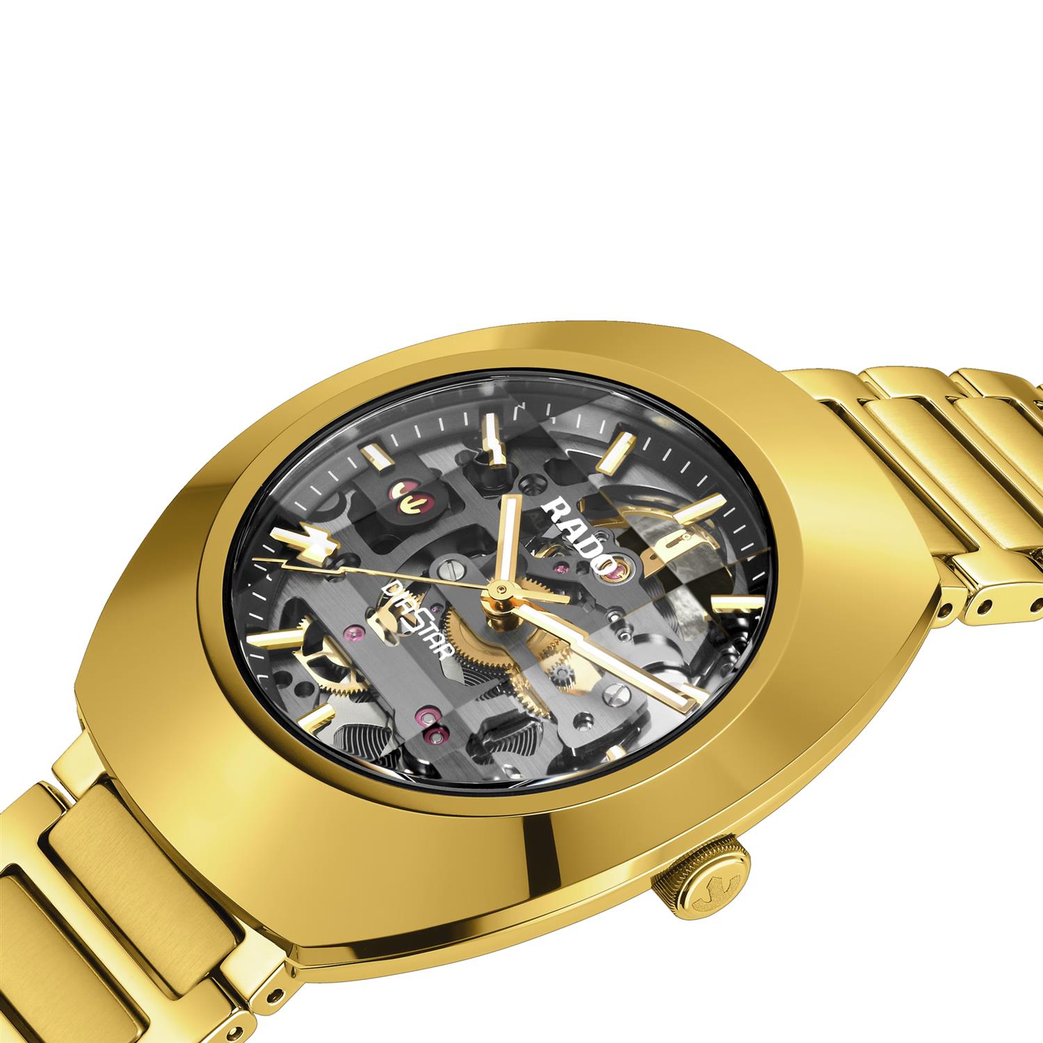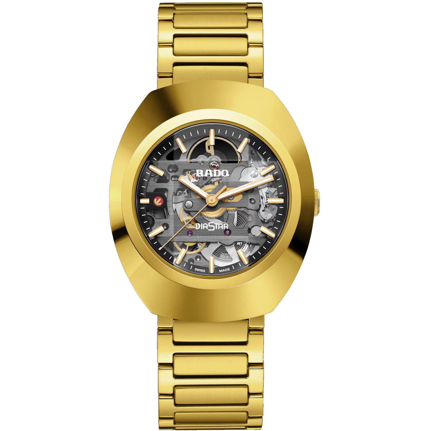ساعت مچی مردانه رادو RADO با طراحی روزانه بند فلزی طلایی با قفل کلیپسی و قاب طلایی و صفحه اسکلتون طوسی با قابلیت داشتن شب نما و موتور اتوماتیک سوییسی با انرژی مکانیکی و مقاوم در برابر آب تا عمق 100 متر به همراه گارانتی بین المللی