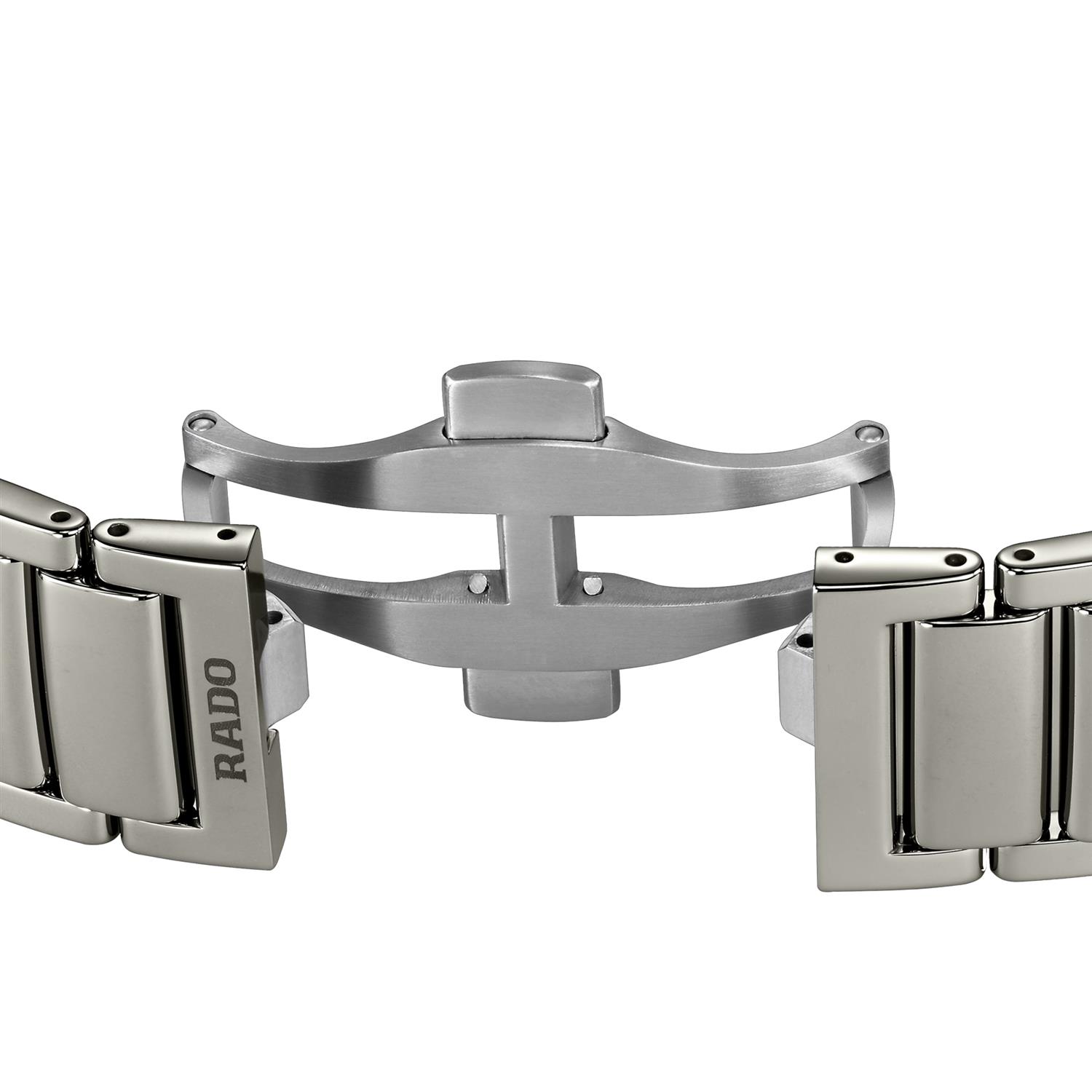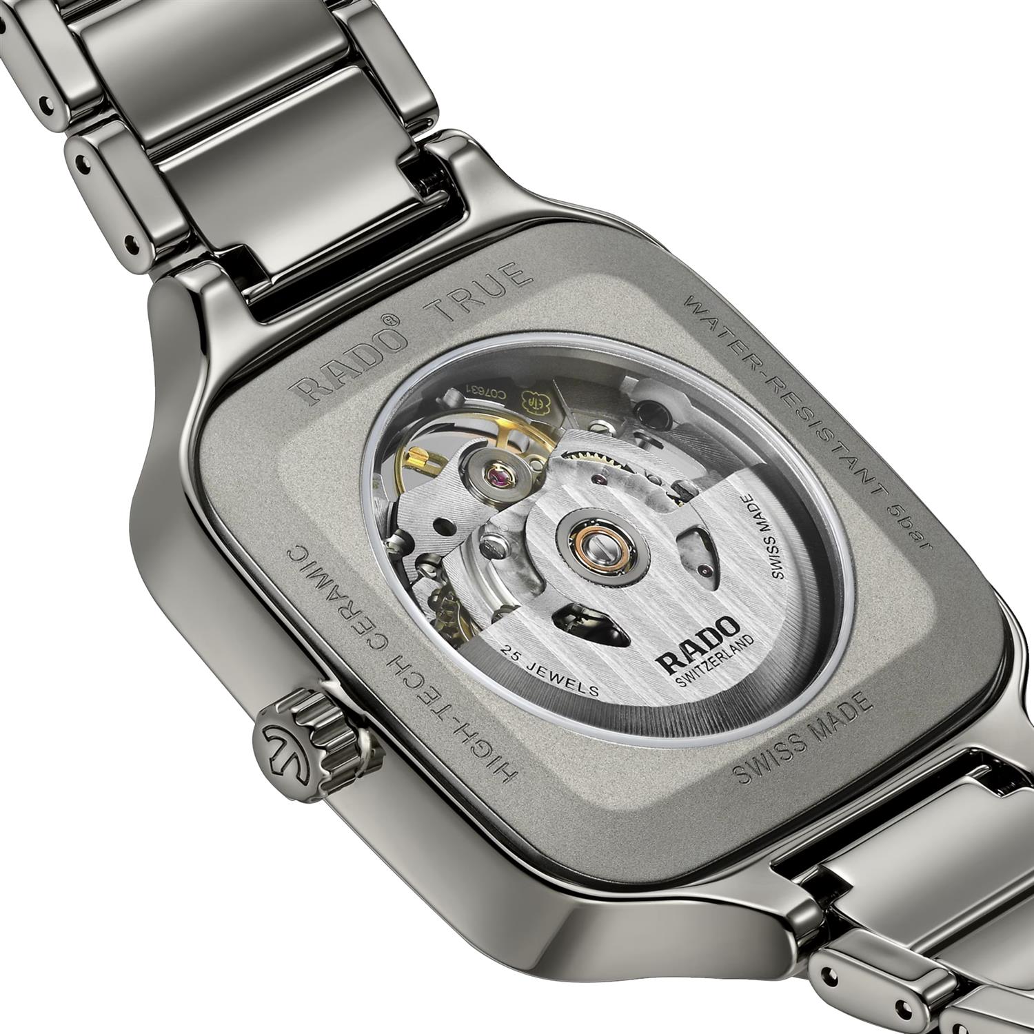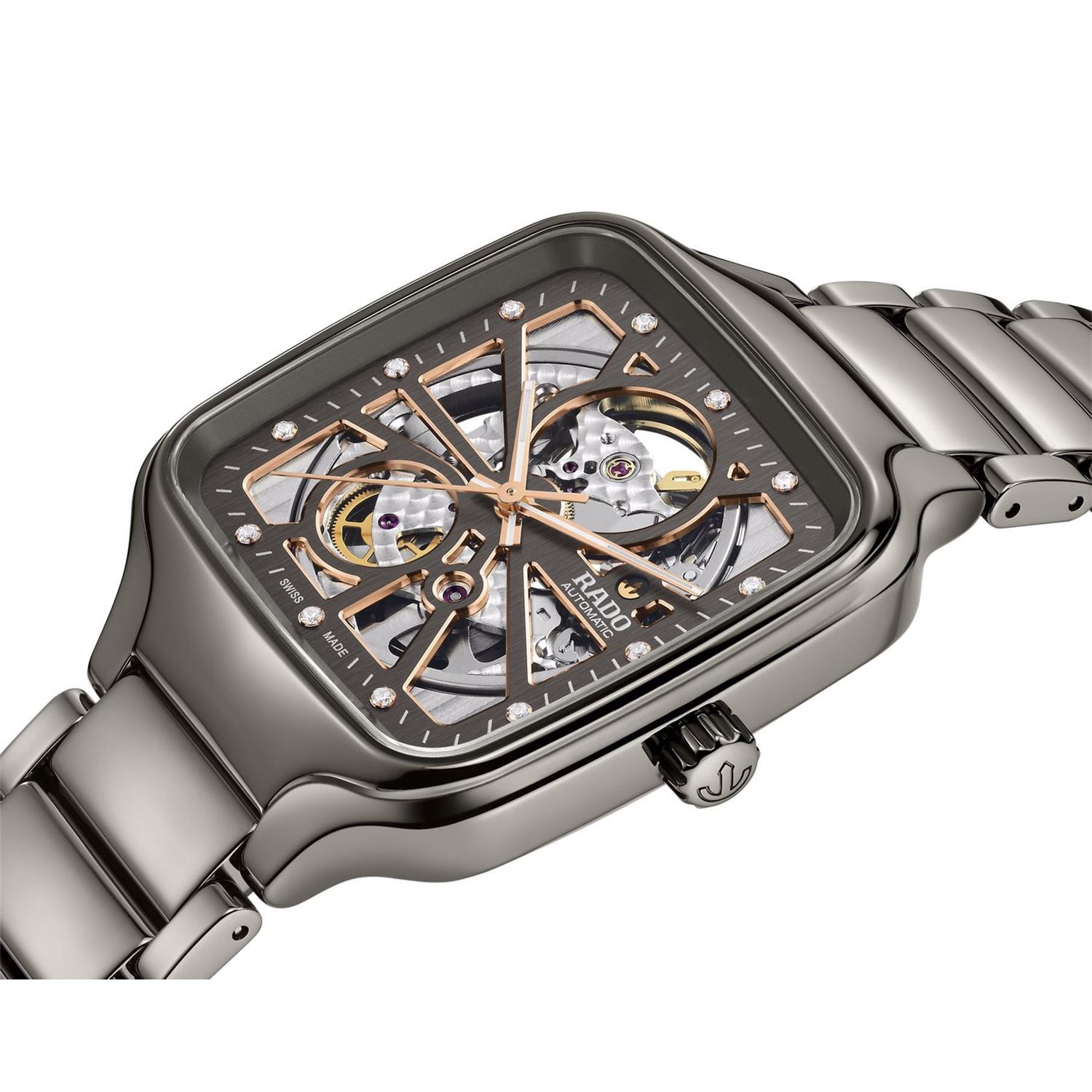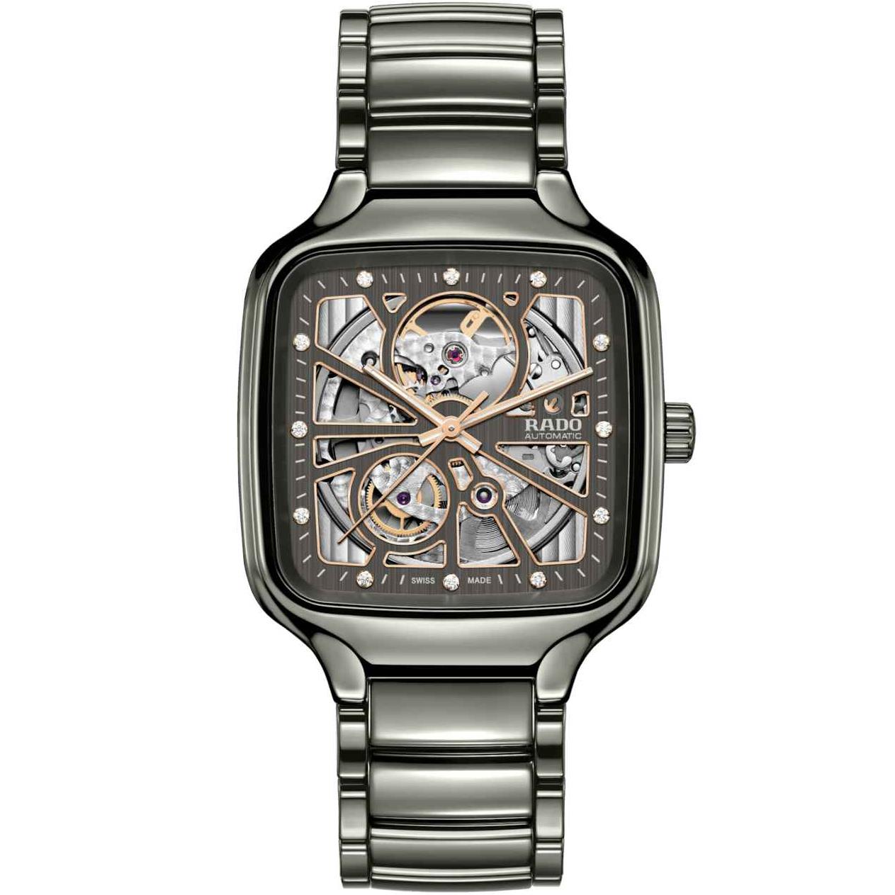 ساعت مچی مردانه رادو RADO با طراحی روزانه بند سرامیکی طوسی با قفل کلیپسی و قاب مربعی شکل دودی و صفحه اسکلتون طوسی مسی با قابلیت داشتن شب نما و موتور اتوماتیک سوییسی با انرژی مکانیکی و مقاوم در برابر آب تا عمق 50 متربه همراه گارانتی بین المللی