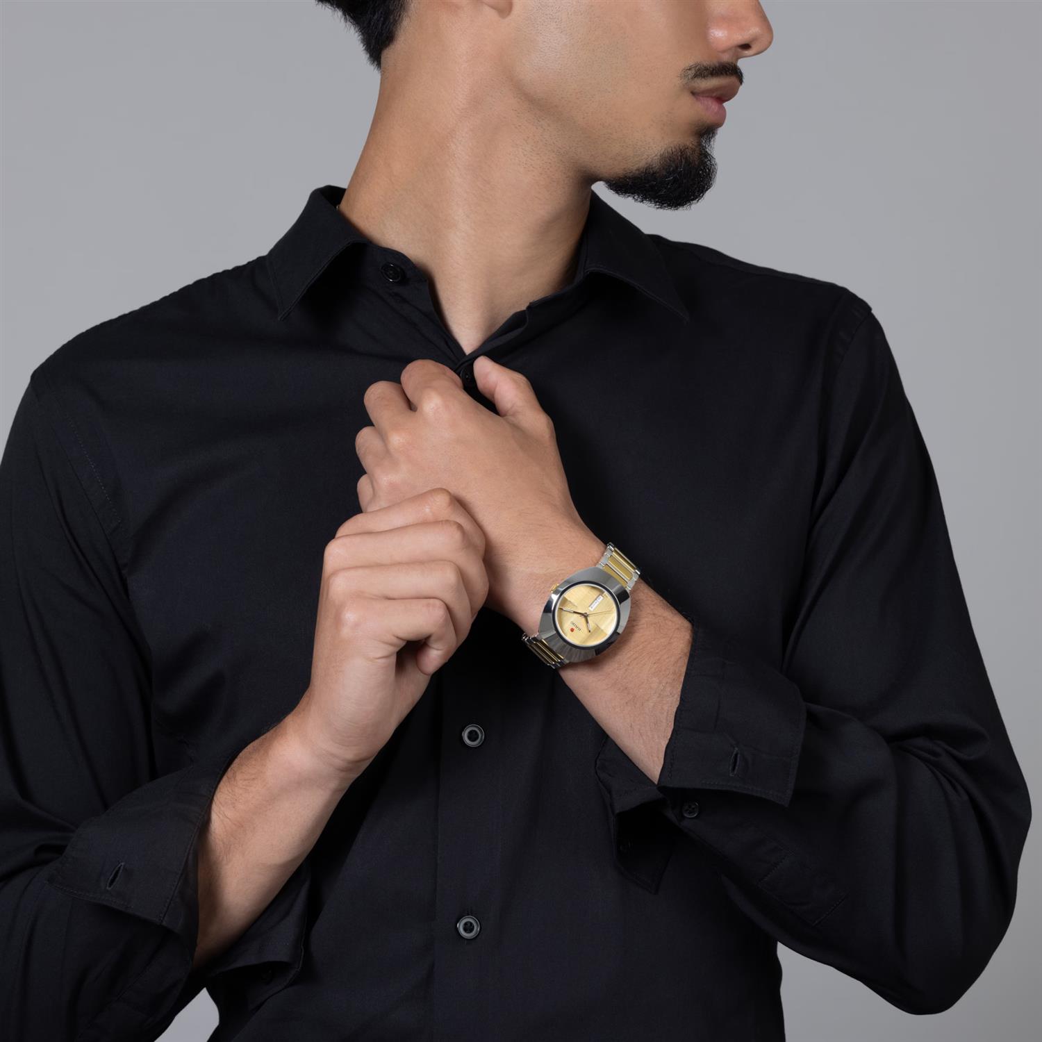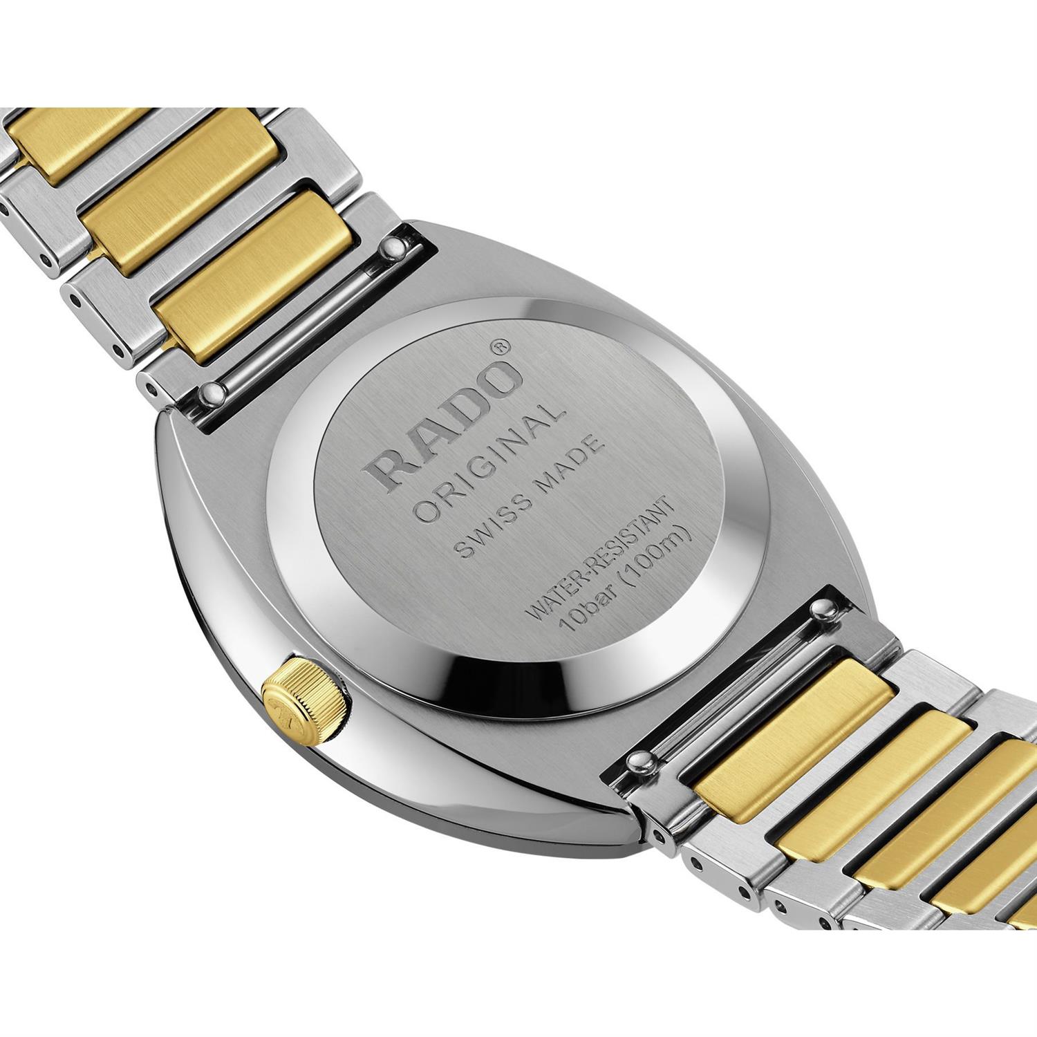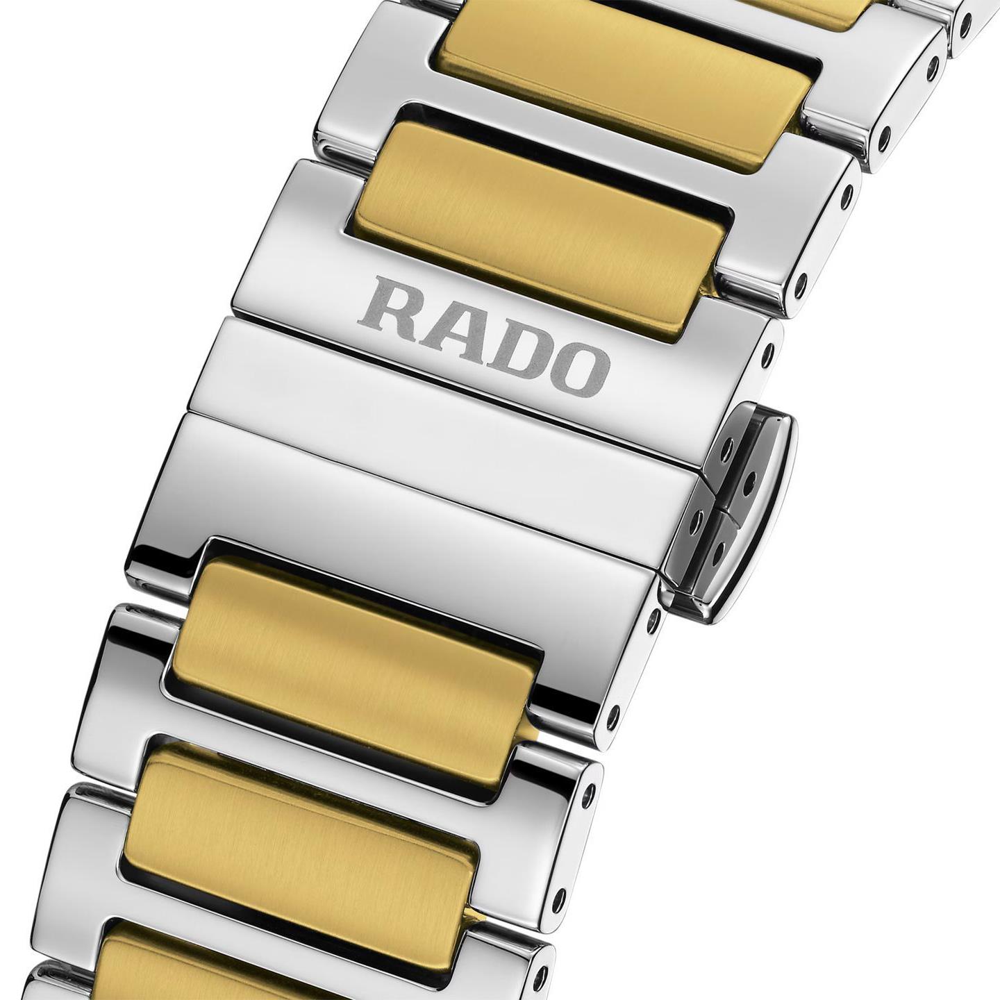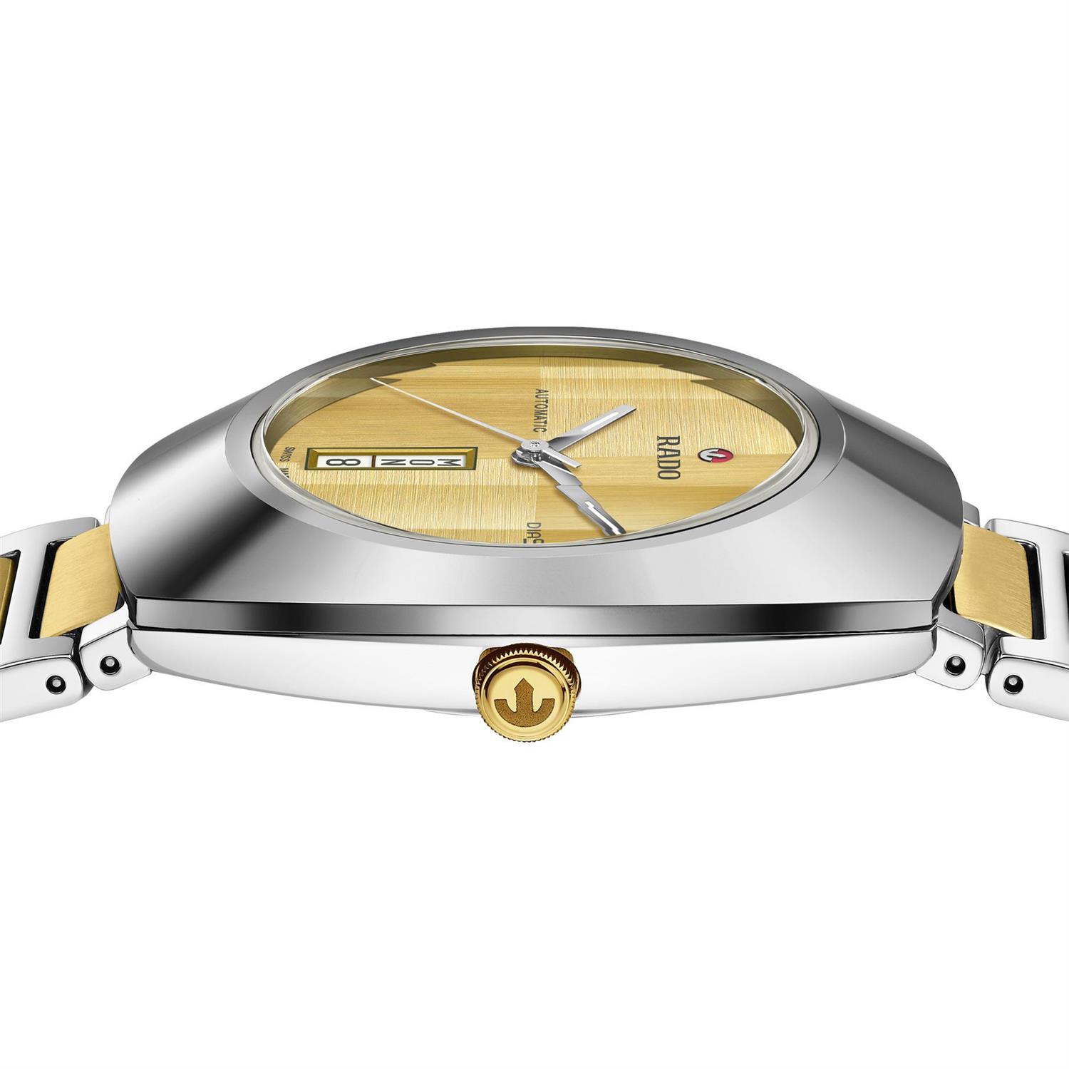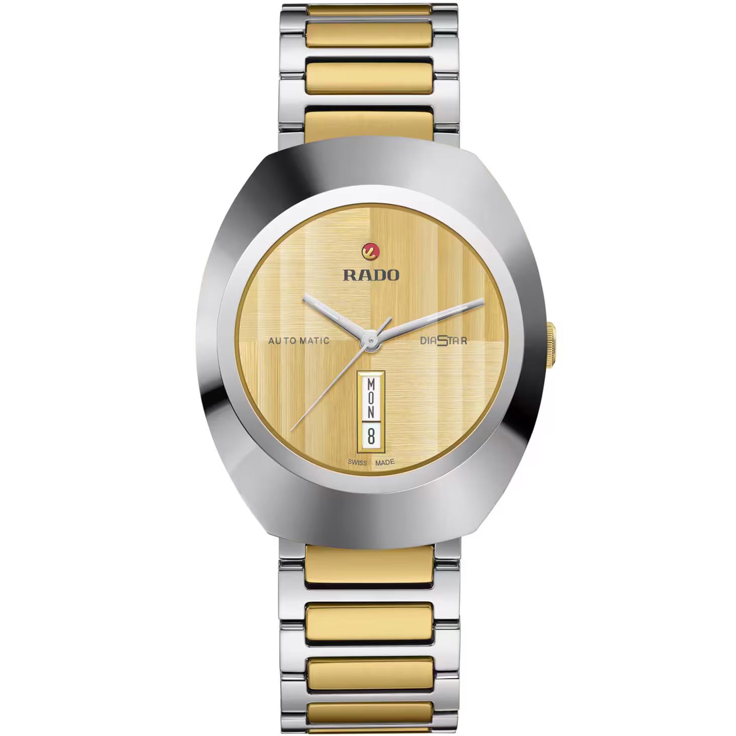 ساعت مچی مردانه رادو RADO با طراحی روزانه بند استیل طلایی و قاب متفاوت استیل و صفحه گرد طلایی با قابلیت داشتن تقویم/ شب نما / روزهای هفته و شیشه ضد خراش و موتور اتوماتیک سوییسی با انرژی مکانیکی و مقاوم در برابر آب تا عمق 100 متر به همراه گارانتی بین المللی
