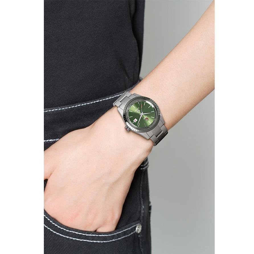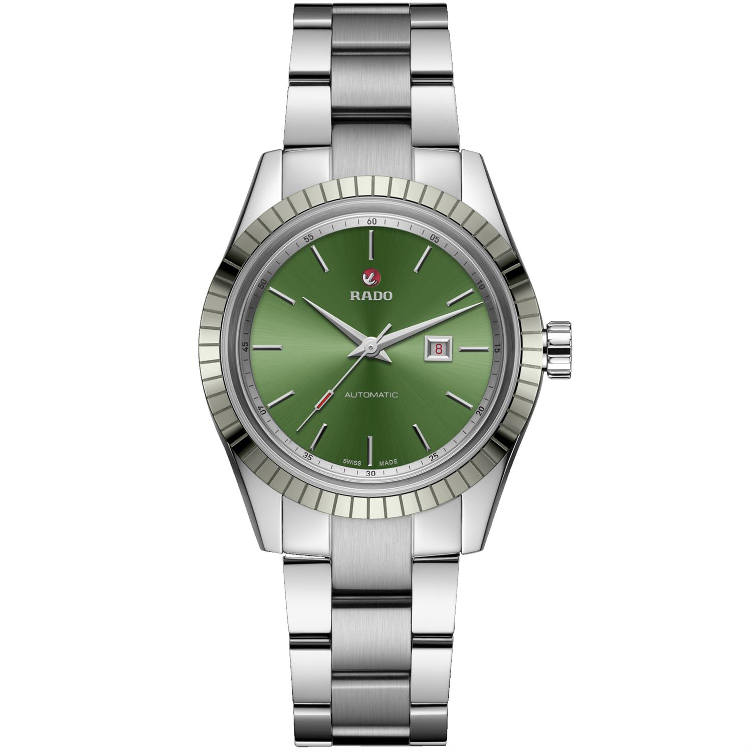 ساعت مچی زنانه رادو Rado با طراحی روزانه بند استیل و قاب استیل با صفحه گرد سبز و شیشه ضد خراش با قابلیت داشتن تقویم و موتور اتوماتیک سوییسی با انرژی مکانیکی و مقاوم در برابر آب تا عمق 50 متر به همراه گارانتی بین المللی