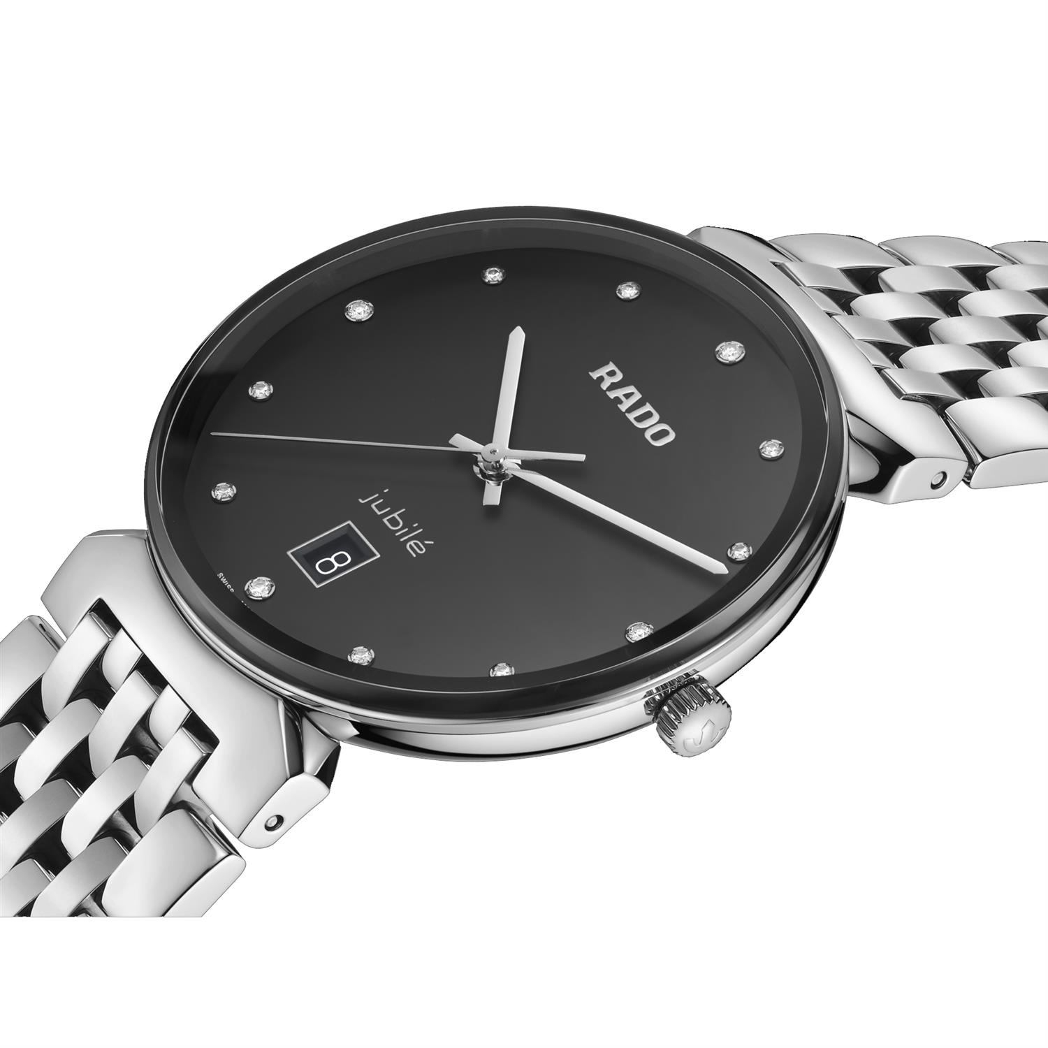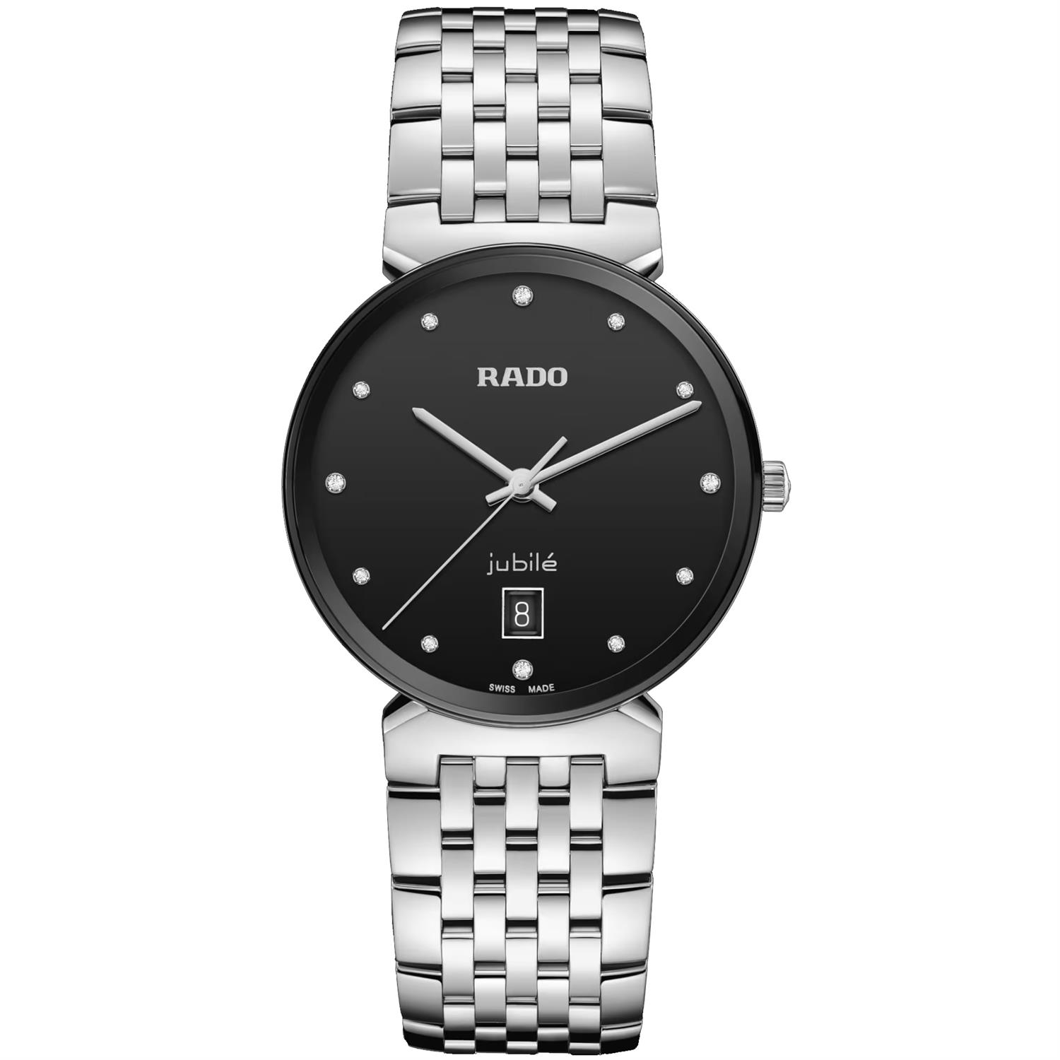ساعت مچی مردانه رادو RADO با طراحی کلاسیک بند استیل و قاب گرد استیل مشکی و صفحه نگین د ار مشکی با قابلیت داشتن تقویم و شیشه ضد خراش و موتورسوییسی با انرژی باتری و مقاوم در برابر آب تا عمق 50 متر به همراه گارانتی بین المللی