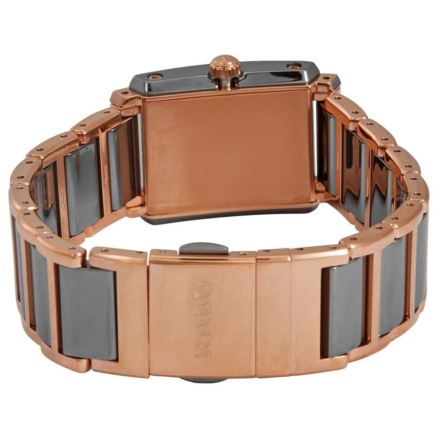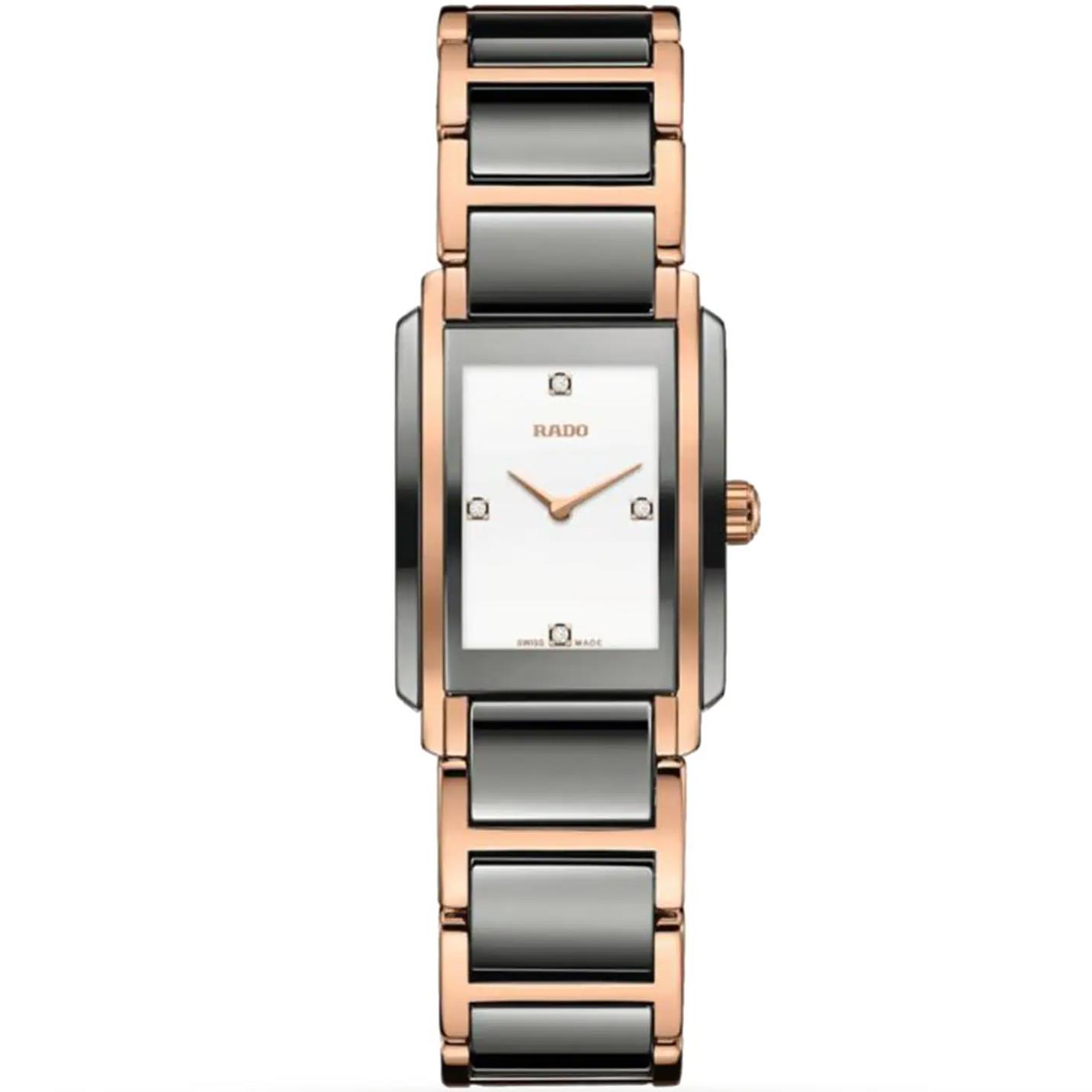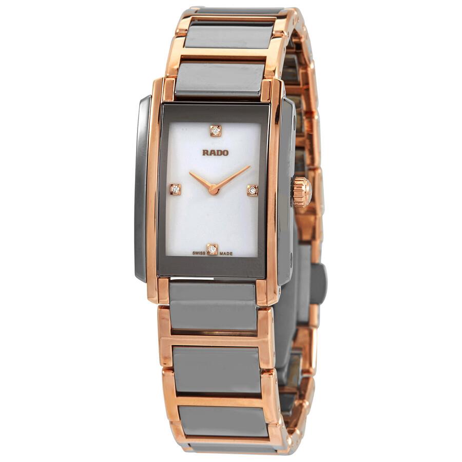 ساعت مچی زنانه رادو Rado با طراحی روزانه بند طوسی مسی و قاب طوسی مسی با صفحه نگین دار سفید و شیشه ضد خراش با موتور سوییسی با انرژی باتری و مقاوم در برابر آب تا عمق 50 متر به همراه گارانتی بین المللی