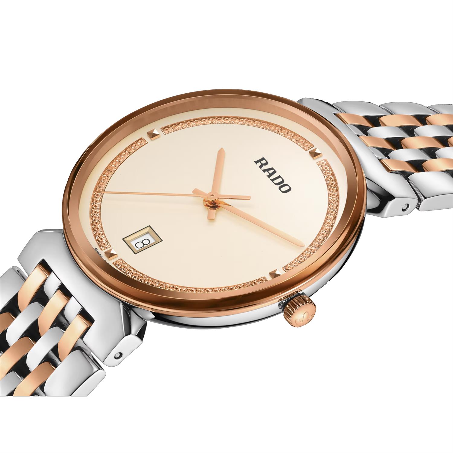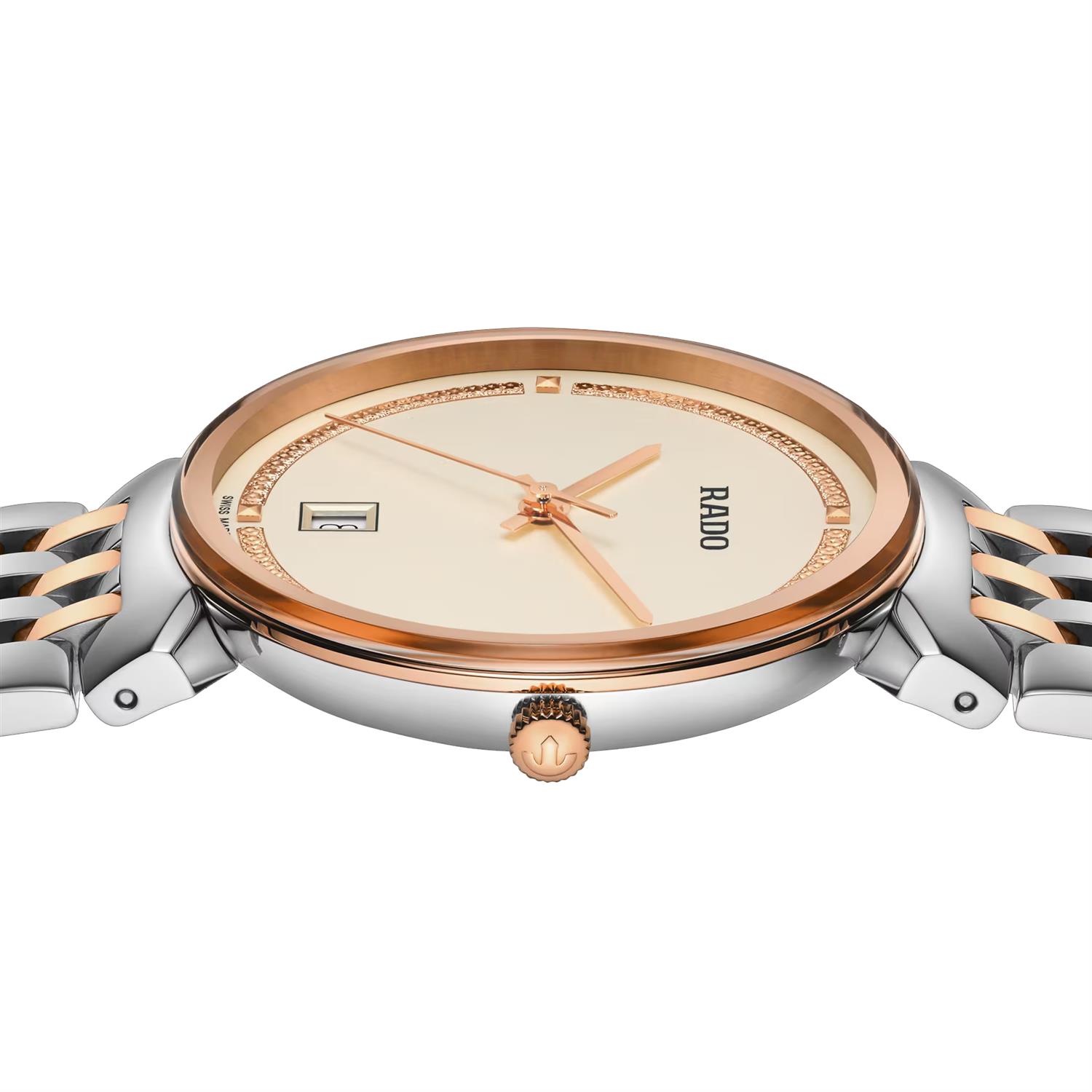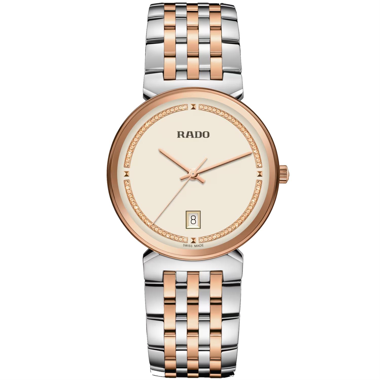 ساعت مچی مردانه رادو RADO با طراحی کلاسیک بند استیل مسی و قاب گرد مسی استیل و صفحه کرمی با قابلیت داشتن تقویم و شیشه ضد خراش و موتور سوییسی با انرژی باتری و مقاوم در برابر آب تا عمق 50 متر به همراه گارانتی بین المللی